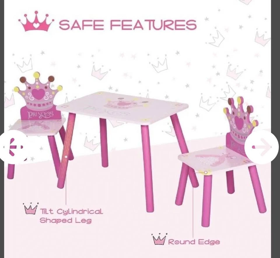 223New, open box. BN-3Pc Kids Wooden Table & Chairs Set – Crown Design! A perfect gift for toddlers who love royal touches! This 3-piece wooden set includes a table and two chairs, all featuring adorable crown motifs. Great for playtime, snacks, or arts and crafts. ✔️ 3-piece set: Small table + 2 chairs ✔️ Crown design on backrests ✔️ Solid wood construction with smooth, rounded edges ✔️ Ideal for bedrooms, playrooms, or as a gift ✔️ Easy assembly required 📏 Dimensions: Table: 20"L x 20"W x 17.5"H Chairs: 11.5"W x 11"D x 19"H | Seat height: 10.5" Weight Capacity: Table 44 lbs; Chairs 77 lbs each 💰 Brand New – Factory packaging with manual included.