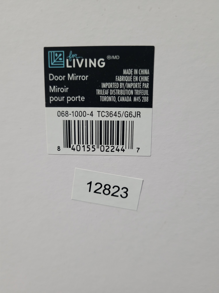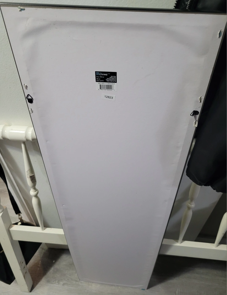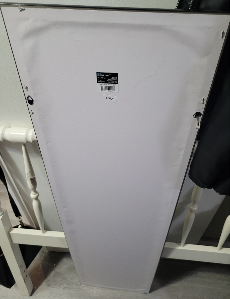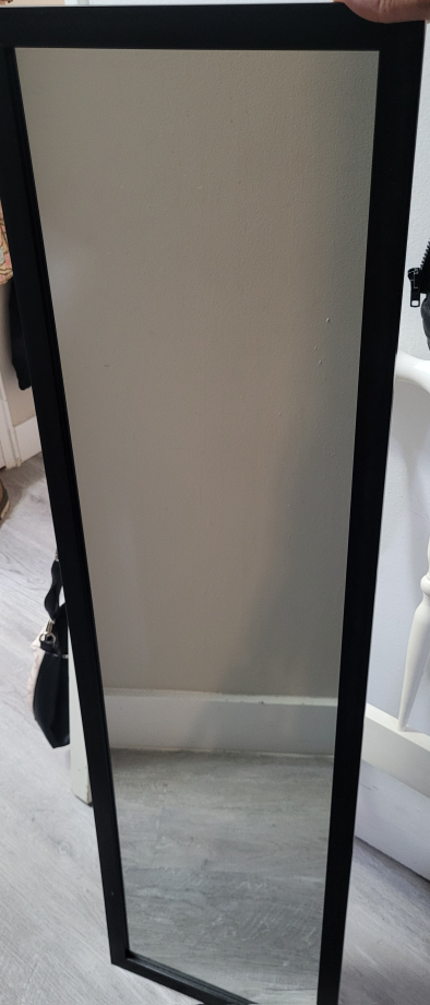 Selling a door mirror by For Living! It has a sleek black frame that would look great in any room. Perfect for checking your outfit before heading out the door