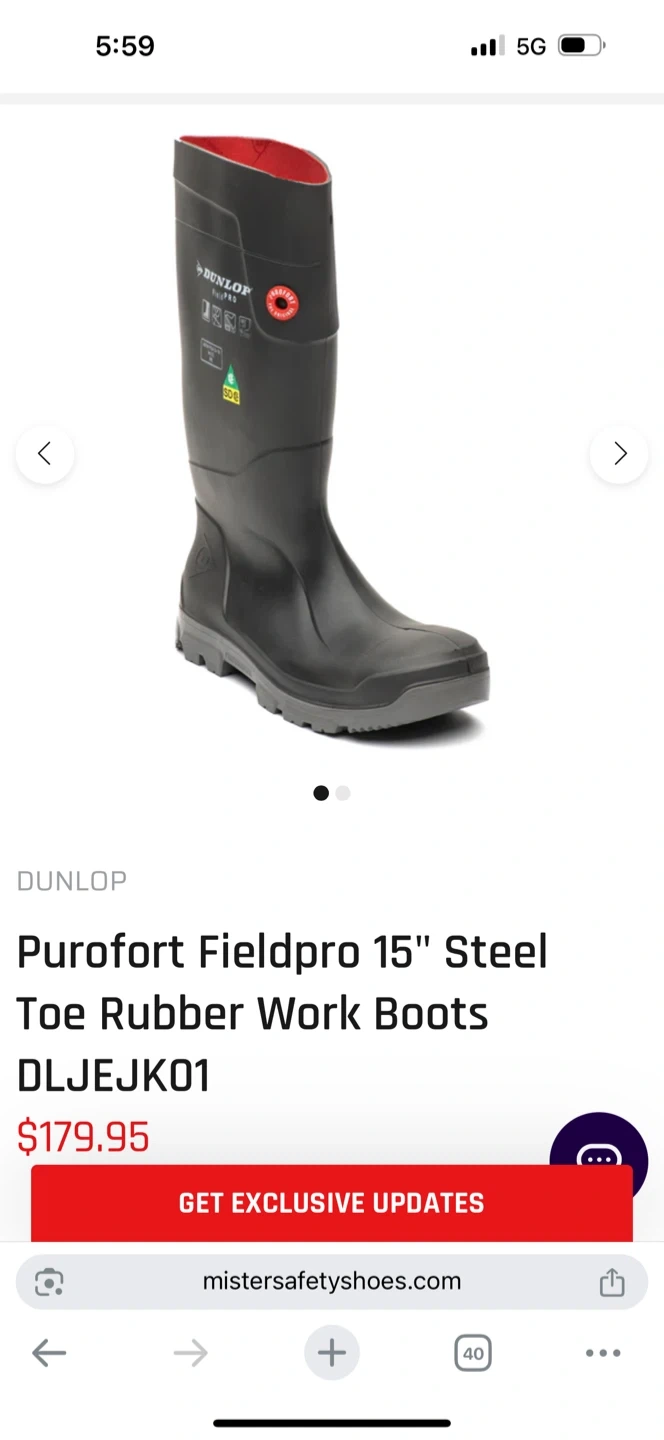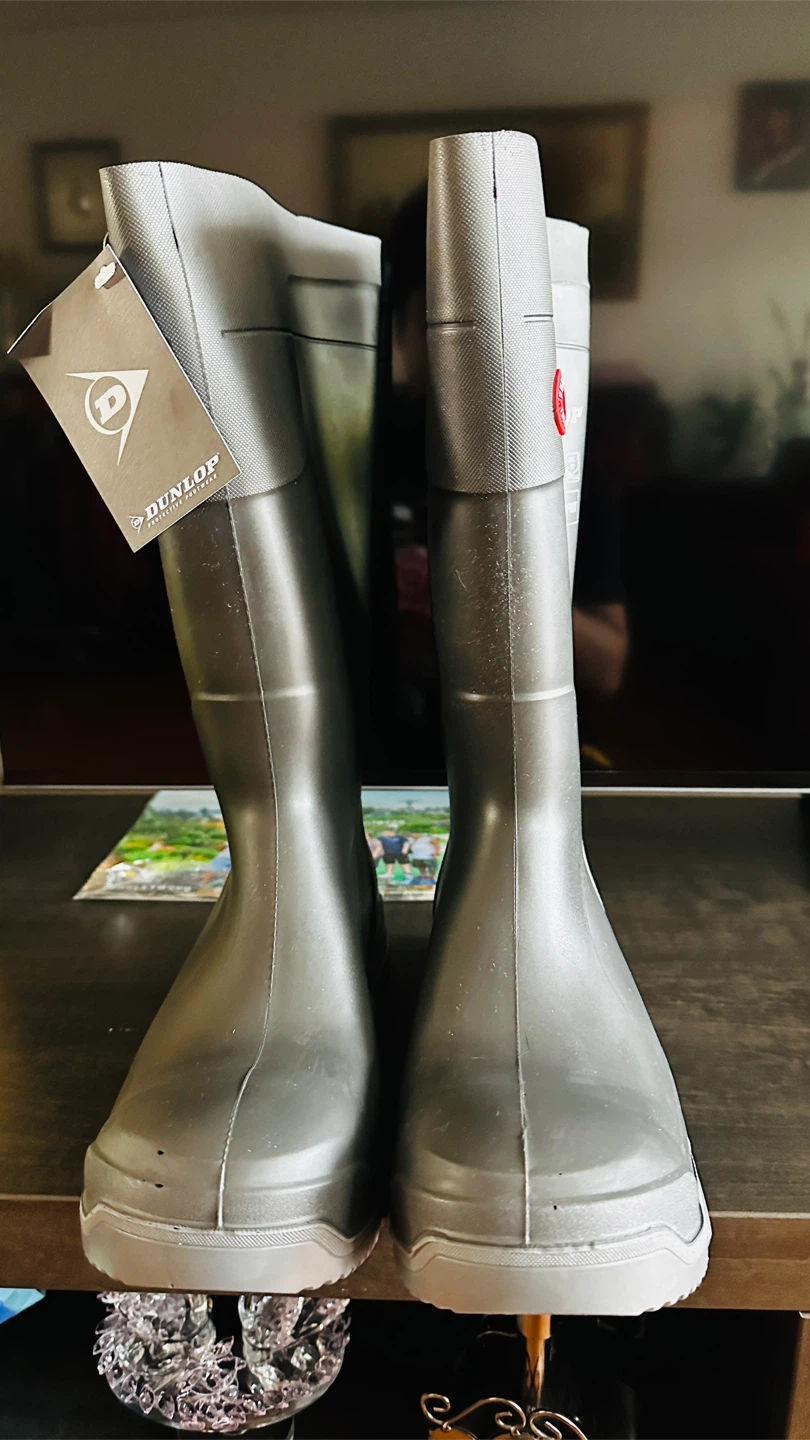 Selling a pair of Dunlop Purofort FieldPRO 15" Steel Toe Rubber Work Boots in size 9. These boots are charcoal/grey and offer full safety features. Retails for $179.95. The box is included!