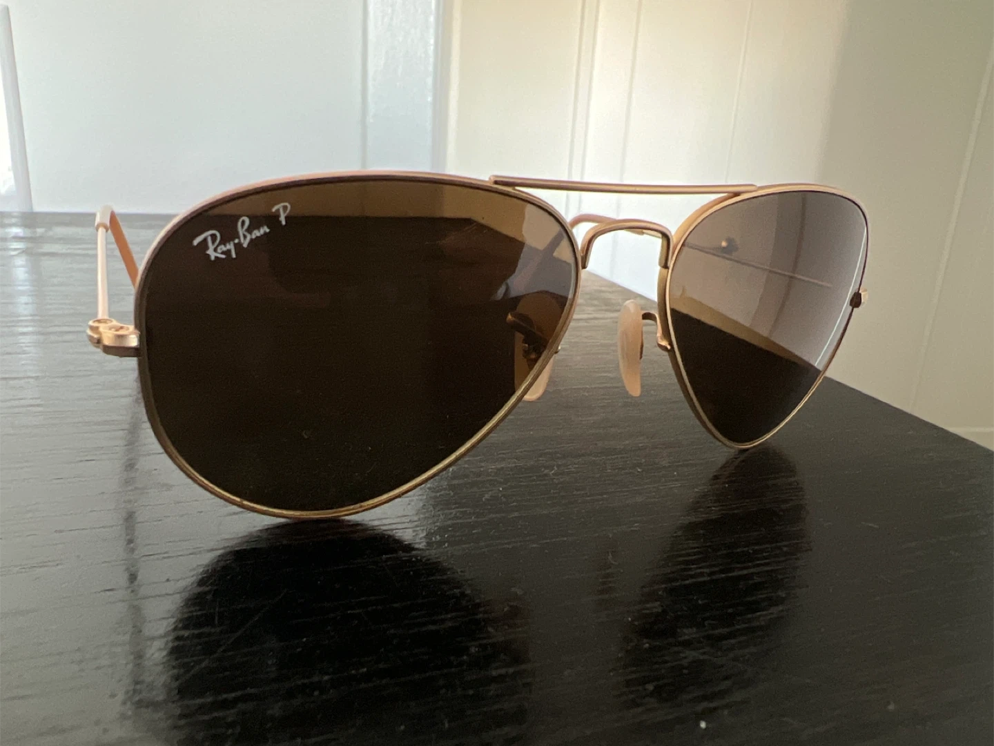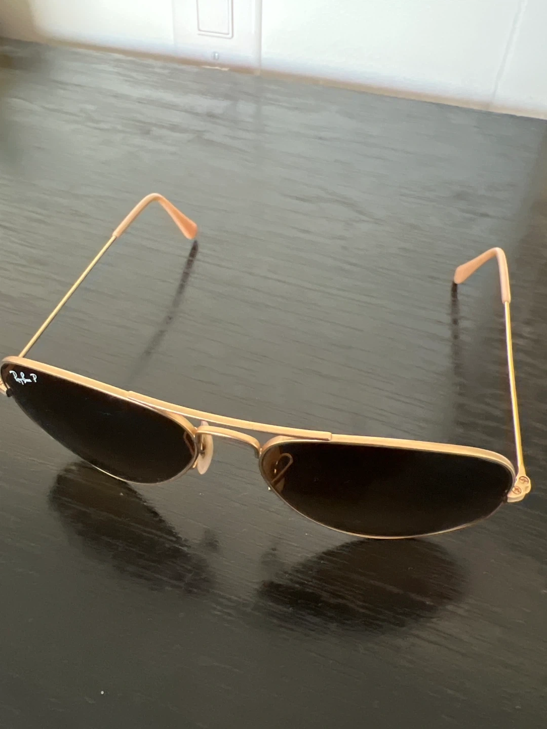 Selling a pair of classic Ray-Ban Aviator sunglasses. They have a stylish gold frame and are in great condition. Perfect for adding a touch of cool to any outfit!.