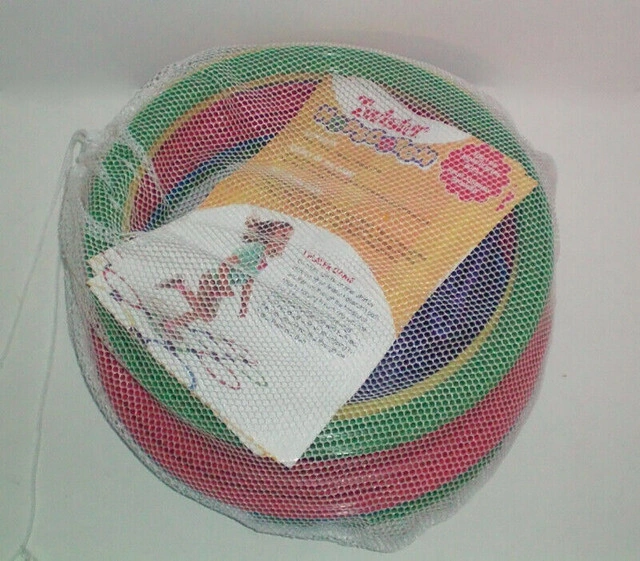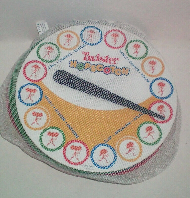 It's a whole new way to hopscotch. There are lots of ways to customize your path! Spin the spinner and hop through the Twister Hopscotch path without touching that color spot. Features: - Play alone or with friends. - Quick to set up. - Easy to learn. - Change your path for a different game. - Durable, non-slip rings for safety. - Age Range: 6 years and above. - Package Contains: rings x 13, ring clips x 16, spinner - Includes mesh carrying case. - New in package The great game of Hop Scotch with a little twist for the better. Let me know if you're interested!