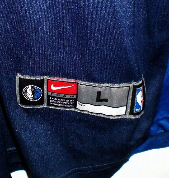 Dallas Mavericks Team Nike Dri-Fit Warm Up Jersey Size Large - V neck long sleeve - Navy blue with light blue contrast - Embroidered logo on front and screen printed on back - Nike and NBA on sleeve and sewn on Nike label on front - Condition: New without tags Mark Kuban says they are the best team ever, & I have to agree