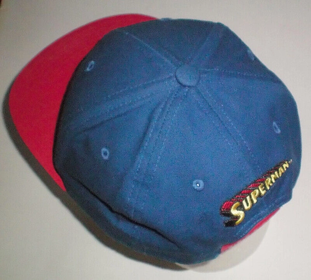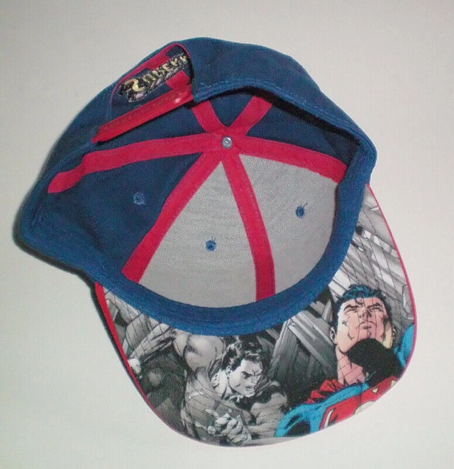 DC Comics Superman Flat Brim Adjustable Cap - Blue with red brim and sewn Superman logo on front and embroidered on back - Comic strip design under brim - New without tags. It’s a Bird, It’s a plane, It’s a really nice Superman Hat, Oh yeah!