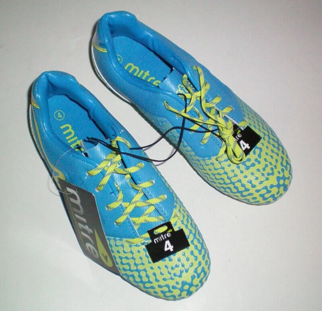 Mitre Low Top Soccer Shoes Size 4 NWT - Baby Blue and Neon Green - Textured toe for better ball control - Cleated outsole for traction on real and artificial grass terrain - Durable heel support and cushioning - New with tags