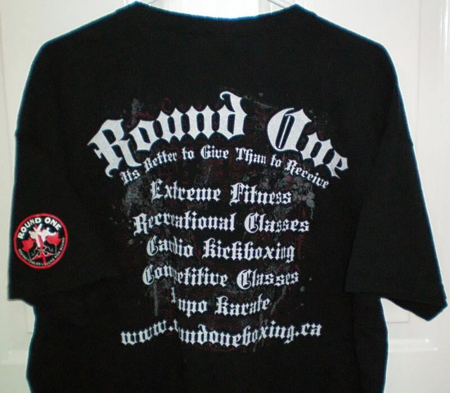 Size: Extra Large. Affiliated with Leo Loucks, whose name is on the shirt. Pro Kickboxing Champion, PKA World Light Weight Champion from 1986 to 1988. Black with screen printed logo on front and wording "It's better to give than receive" on back and logo on sleeve. Preshrunk 100% cotton. Condition: New without tags, Excellent.