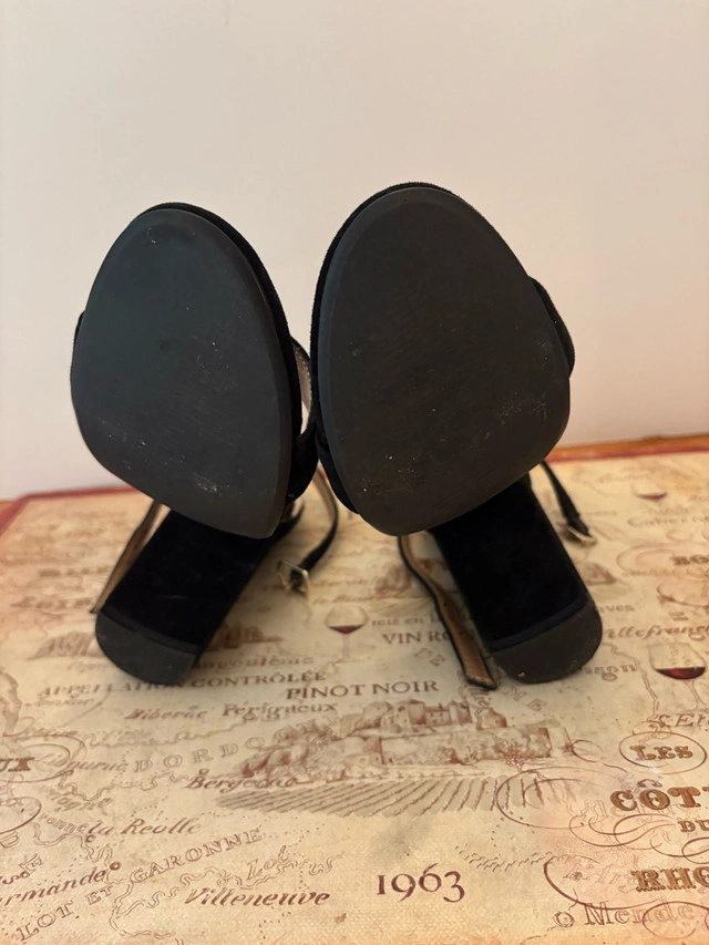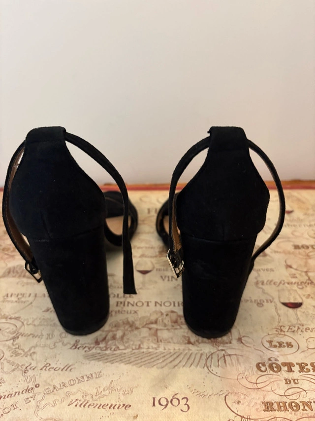 Step out in style with these Steve Madden black suede heels, size 5.5. These stylish heels feature an ankle strap for a secure fit and a chunky heel for added comfort and stability, making them perfect for a night out. These are used, but in very good condition. Additional details: * Brand: Steve Madden * Colour: Black * Material: Suede * Size: 5.5. If the ad is up, the item is still available!