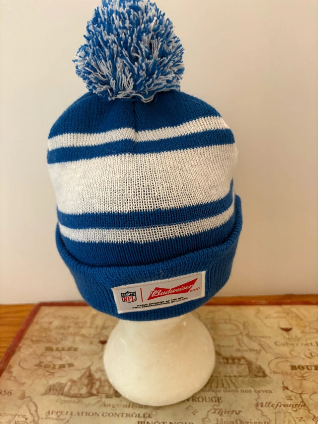 Keep your head warm with this Budweiser Detroit Lions toque, perfect for showing off your team spirit while staying cozy. This item is in good condition, ready for game day or any chilly adventure. Here are some details: * Team: Detroit Lions * Brand: Budweiser * Colour: Blue and White * Style: Pom Pom I'm pricing this one at $15, considering its great condition. Don't miss out on this fantastic find! If the ad is still up, yes, it's available.