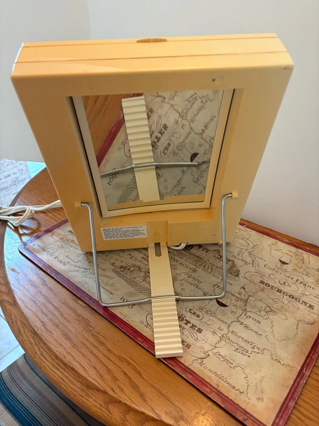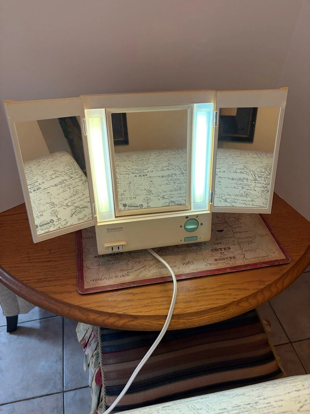 Illuminate your beauty routine with this vintage Remington true to light illuminated vanity mirror, complete with three mirrored panels and convenient electrical outlets for all your styling tools; it is in good working condition. Specifications: * Three-panel mirror design * Integrated illumination for enhanced visibility * Electrical outlets for convenient use of styling tools This vintage mirror has seen a few makeovers in its day, but it's ready for its next close-up! Just a friendly reminder that if the ad is up, it's still available! Based on similar Kijiji listings, I'm pricing it at $45
