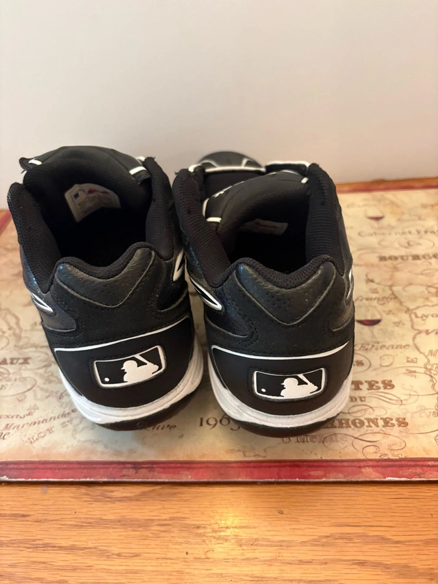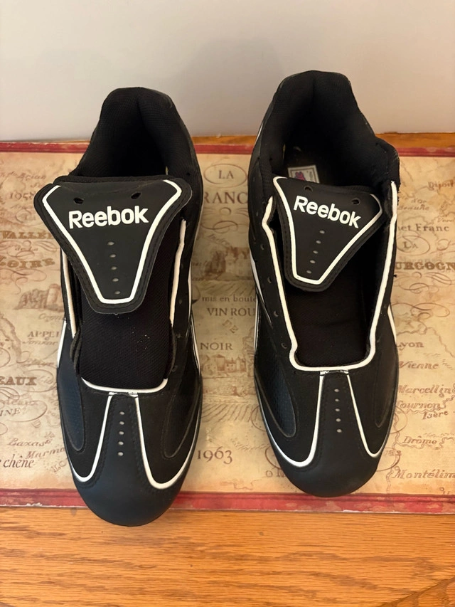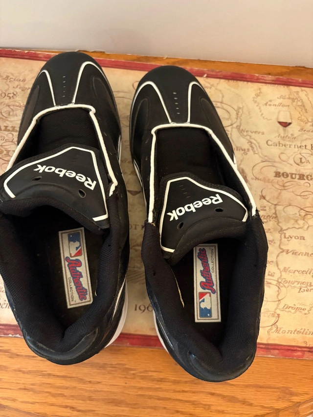 These are a pair of used Reebok baseball cleats, perfect for your next game. They feature a black and white design with the Reebok logo and MLB logo. The cleats are in good condition. * Brand: Reebok * Sport: Baseball * Type: Cleats * Colour: Black / White * Size: 8