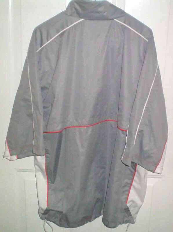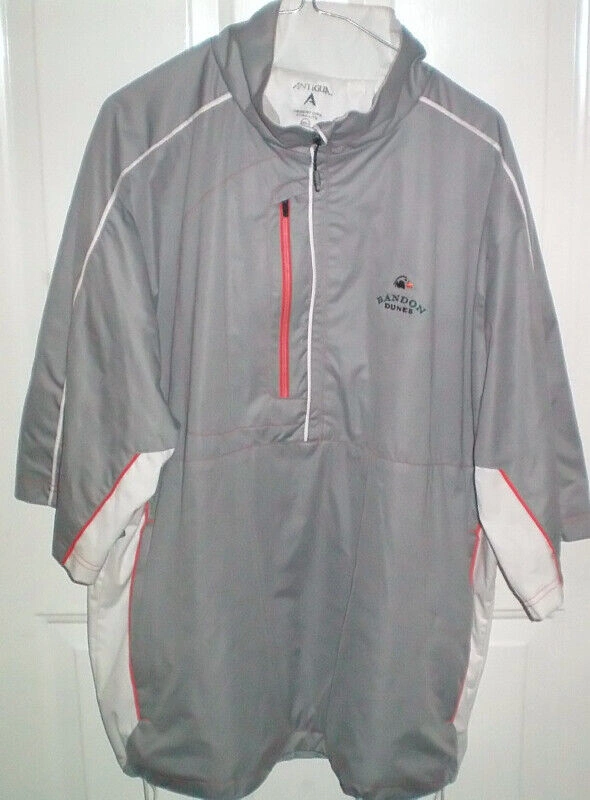 Antigua Men's Desert Dry Xtra Lite 1/2 Zip Golf Jacket Size XL. Grey with orange and white piping and white insets on sides. Embroidered Bandon Dunes Oregon Golf Resort logo on front. 100% polyester water resistant woven short sleeve wind jacket. Chest zipper pocket and 2 hip zipper pockets. 100% polyester mesh lining. Stand up collar with zip placket. Back breathable flap. Adjustable waist pulls. Like new condition.