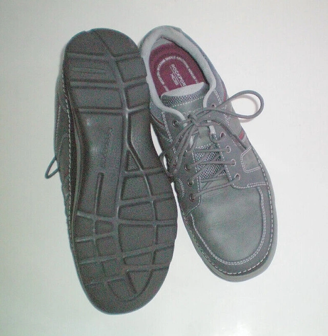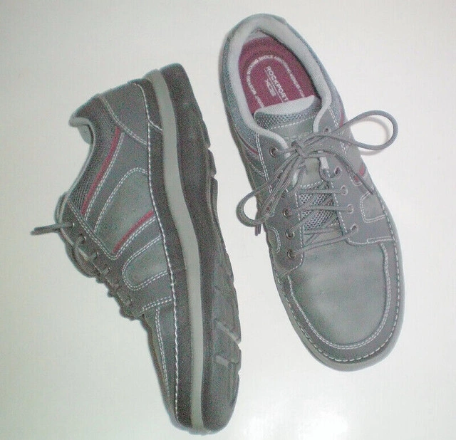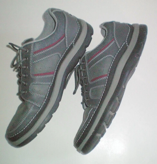 Rockport XCS Walking Shoes, size 10. Grey leather with burgundy accents. Lace up style. Lightweight to provide comfort. EVA outsole provides shock absorption to help reduce foot and leg fatigue. Strobel construction helps give you that forefoot flexibility. EVA footbed with Memory Foam cushioning is designed to conform to the shape of your foot for a personalized fit every time you lace them up. Mesh lining wicks away moisture and enhances breathability. Condition: In excellent like new shape.