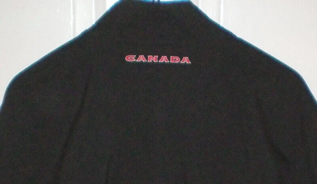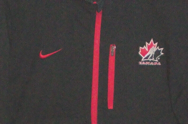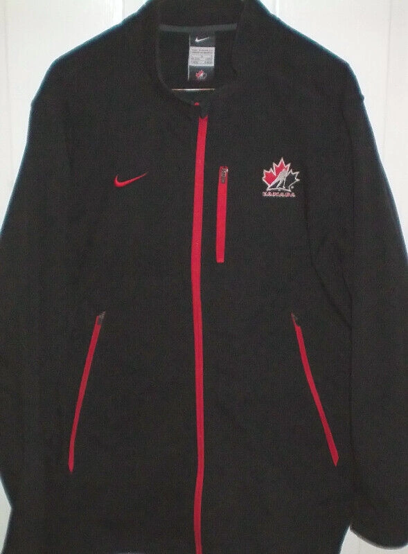 Nike Team Canada Zippered Rink Jacket Men's Large - Mock turtle neck with full zipper and tab at top to hide zipper - Black with red trim on pockets and front zipper - Embroidered Team Canada Logo and Nike swish on front and the Word Canada on back neck - 2 extra large zippered pockets plus one zippered media pocket with ear phone hole - 100% polyester with woven fibre lining - Adjustable draw string waist closure - Length 28", Armpit to armpit 23" - Condition: Near new, Excellent shape
