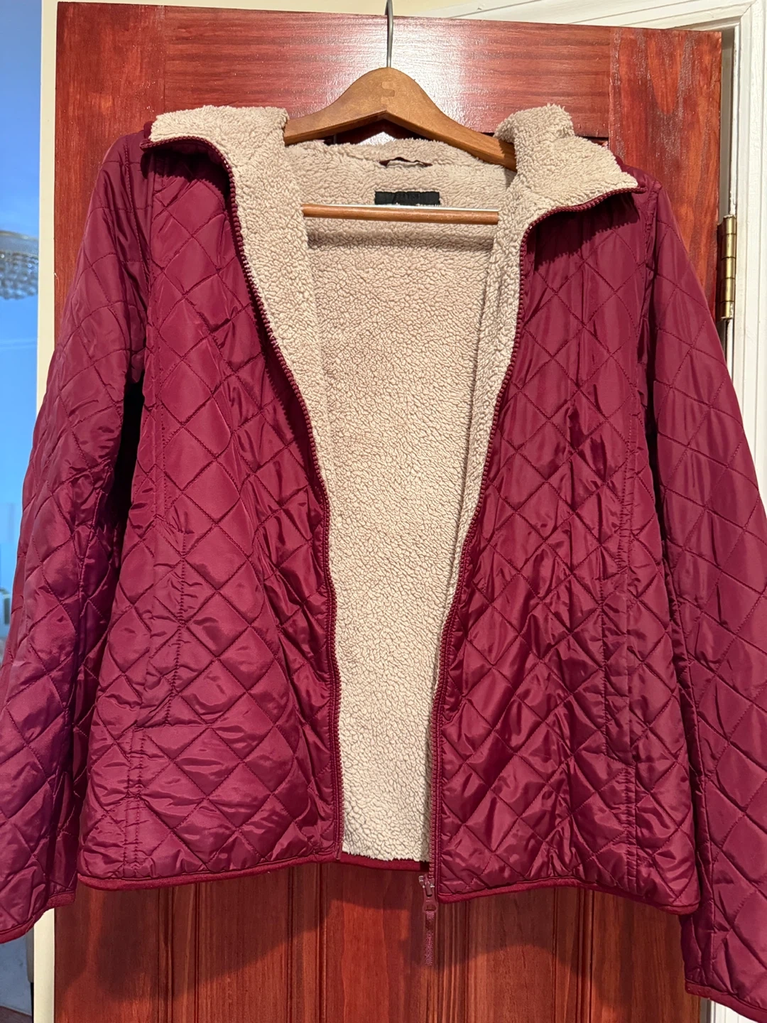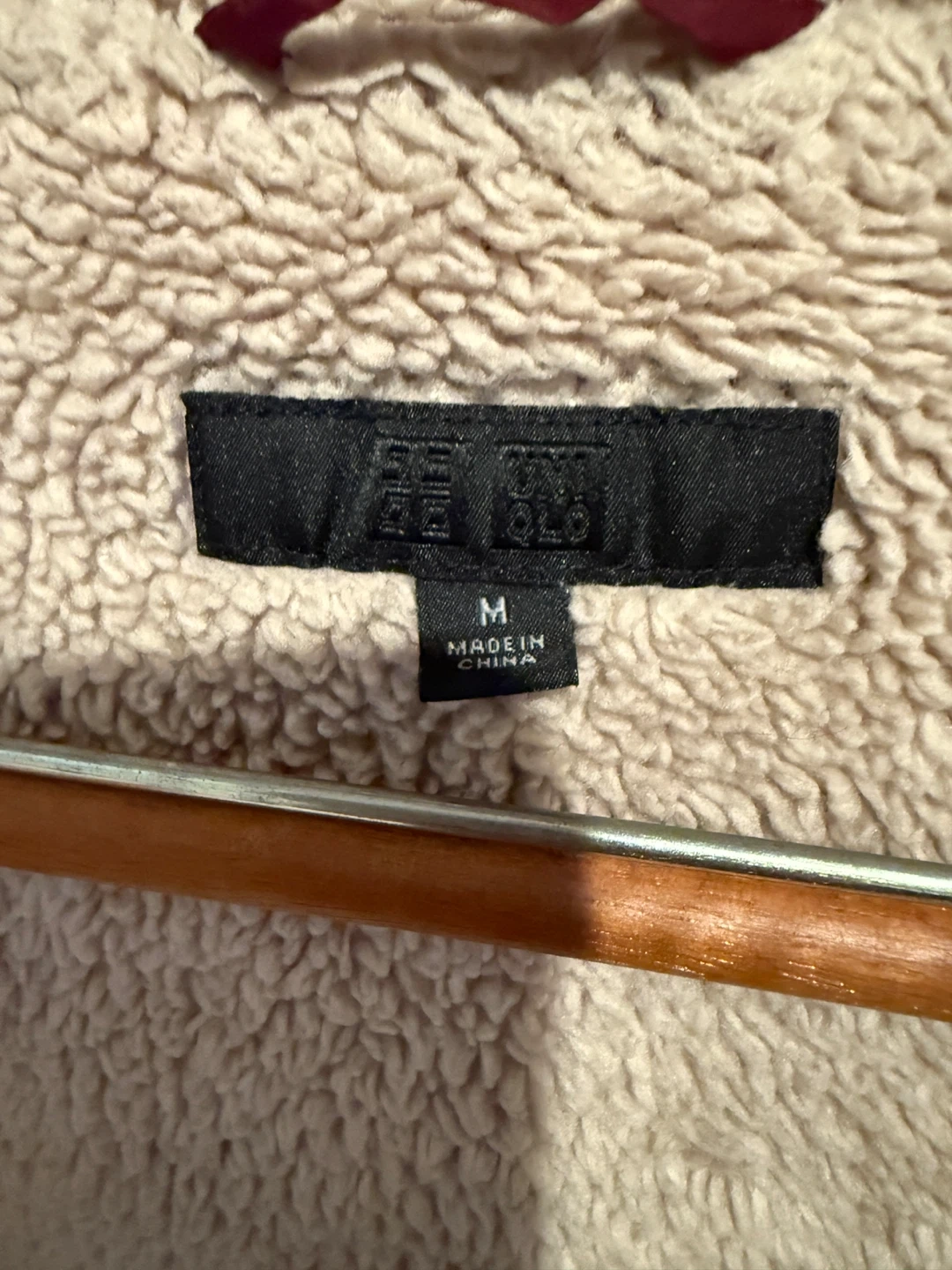 211Selling a Uniqlo padded jacket in size medium. It's a quilted design with a cozy, sherpa-like lining. The outer color is a nice burgundy shade. Perfect for staying warm and stylish!