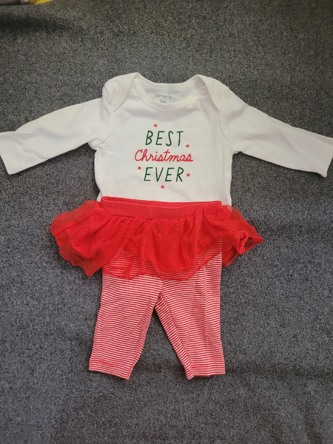 242A super cute Carter's Christmas outfit in size 3M! It includes a long-sleeved onesie with "Best Christmas Ever" printed on it, a red tutu skirt, and red and white striped leggings