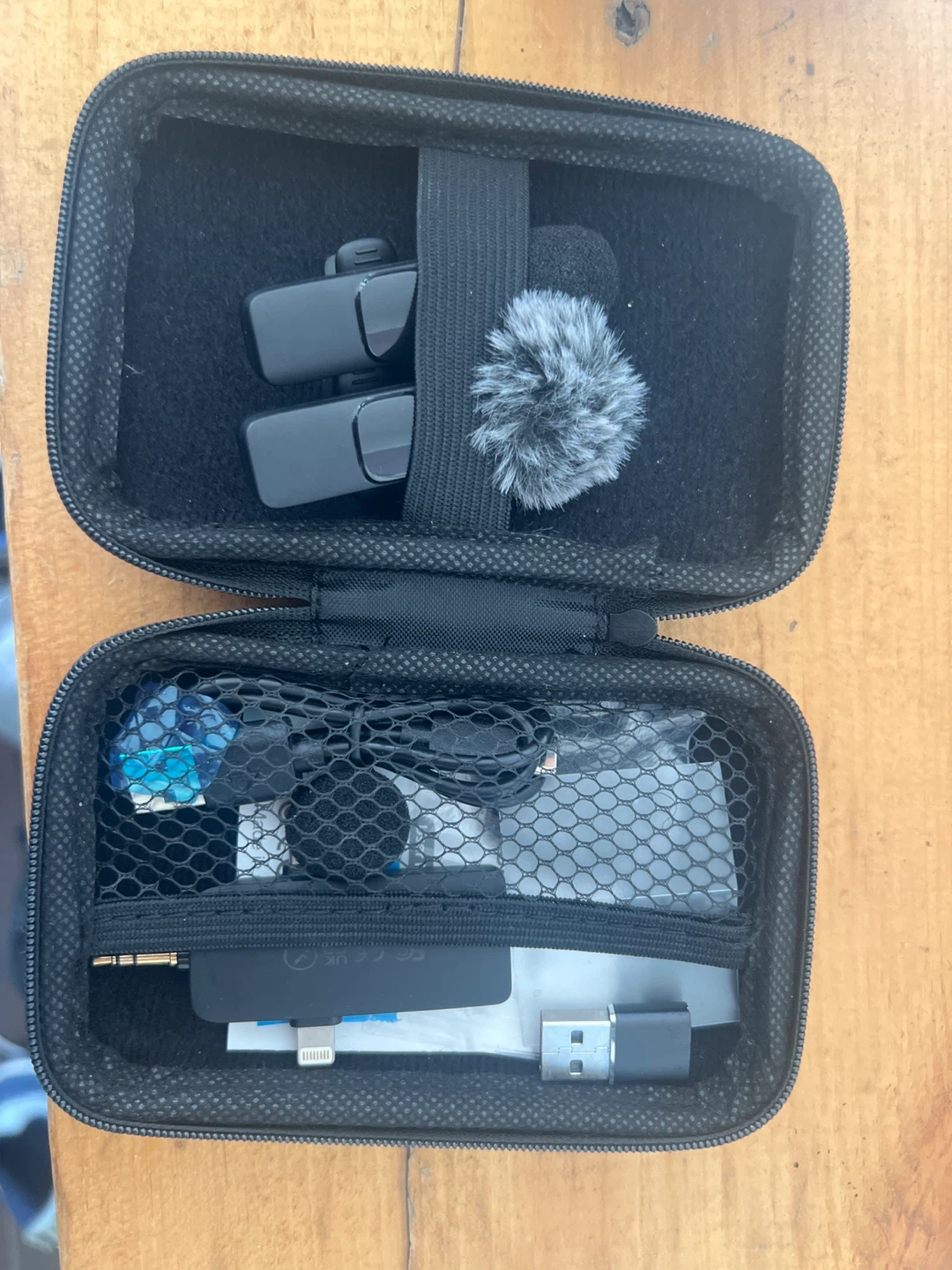 • Wireless Microphone Kit (with case) includes dual clip-on mics, windshields, receiver (Lightning + USB-C), and all accessories for crisp audio.