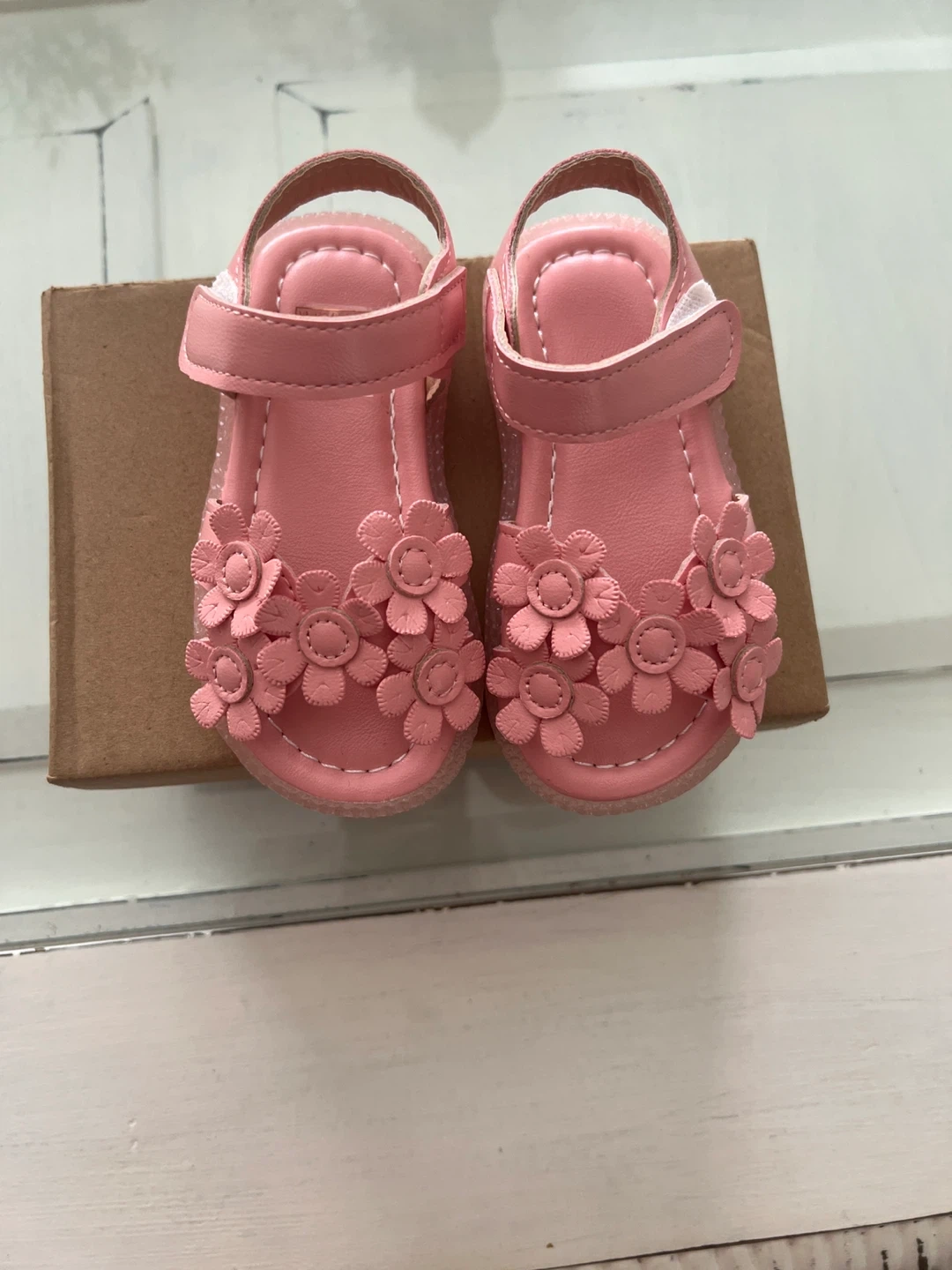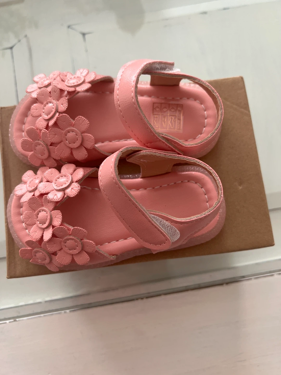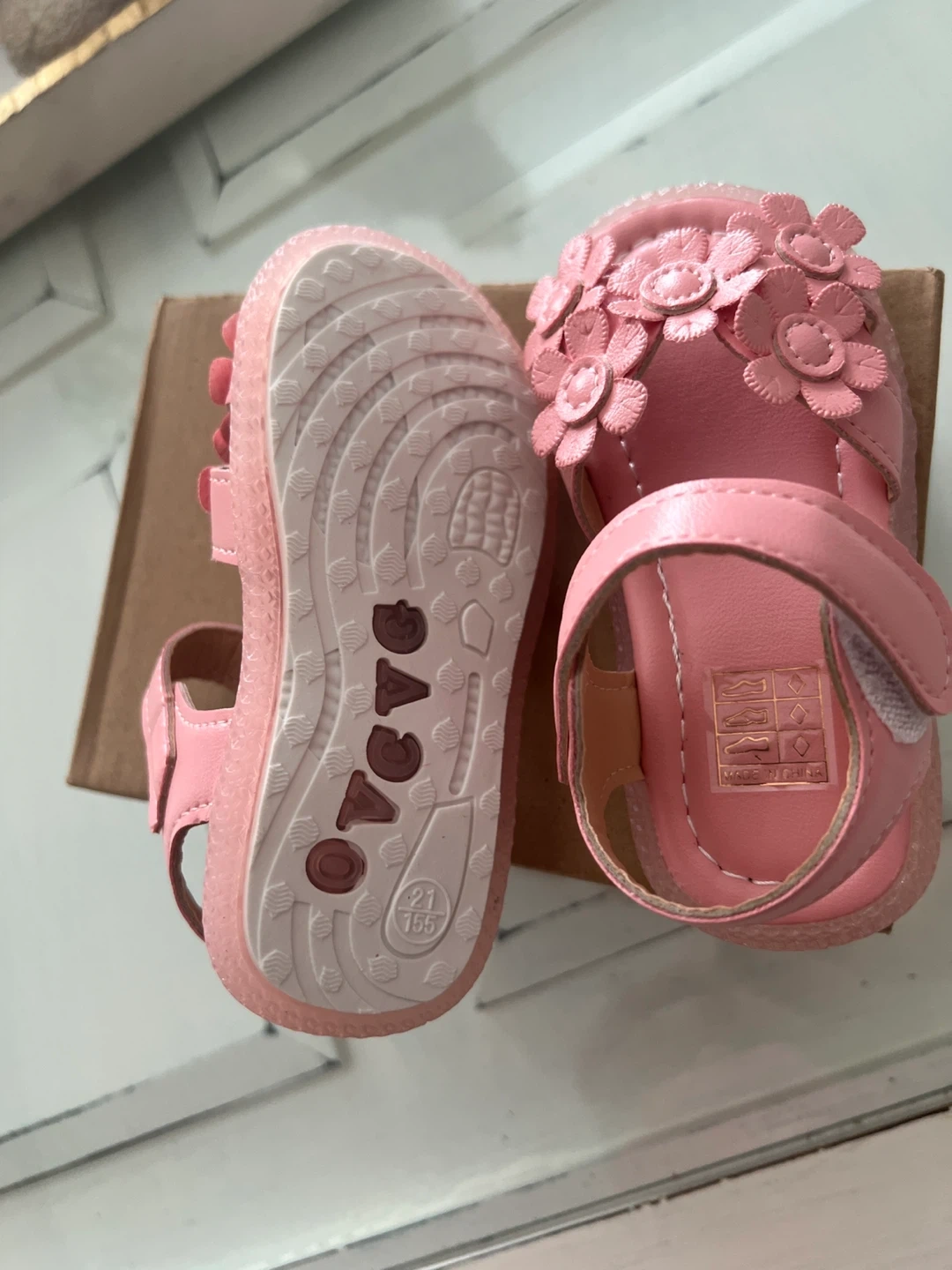 70These adorable pink sandals are brand new and ready for your little one! They feature sweet flower detailing on the front and a convenient velcro strap. Size 21 (EU), which is approximately a toddler size 5 US. Comes with the original box