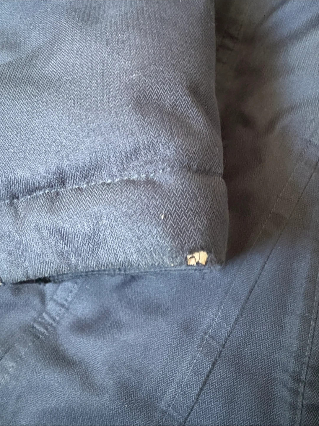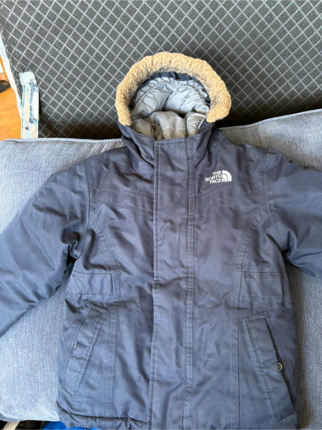 Selling a The North Face kids' winter jacket in size 4T. It's a navy blue colour and has a faux fur trim on the hood. There is a small tear on the sleeve, as shown in the photos.