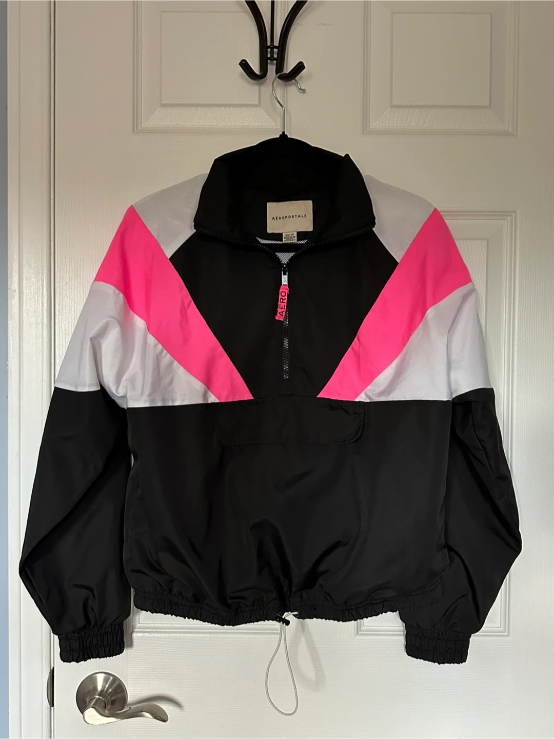 Selling a cute Aeropostale jacket! It's a colour-blocked design with black, white, and hot pink. The size is XS. Perfect for a sporty look!