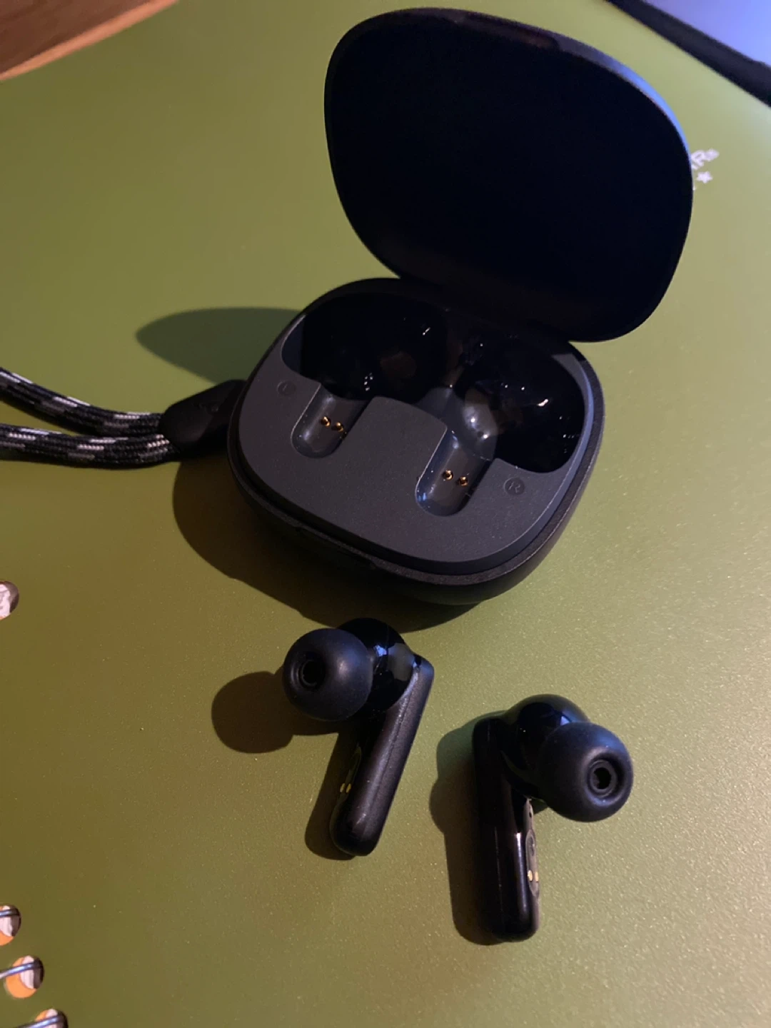 Selling a pair of Soundcore P20i true wireless earbuds in black. They come with their charging case and a handy wrist strap. The model number is A3949. These earbuds are lightweight and portable, perfect for on-the-go listening