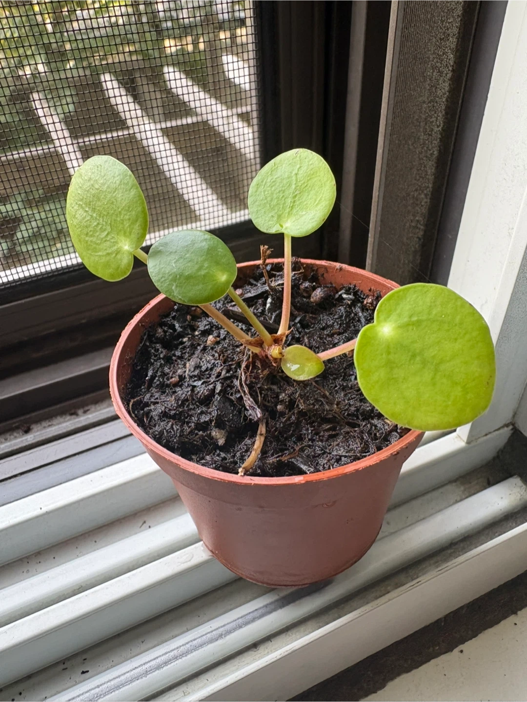 Selling a cute pilea peperomioides, also known as a Chinese money plant! It's in a starter brown pot and has several healthy, round leaves. Perfect for adding a touch of green to your home or office