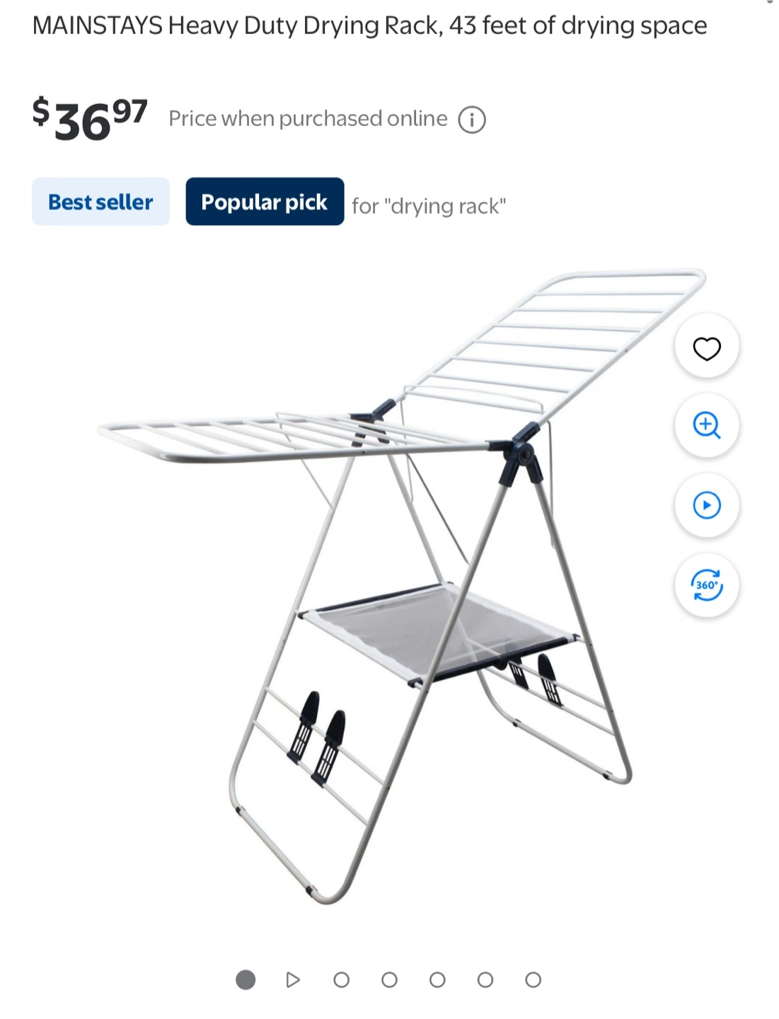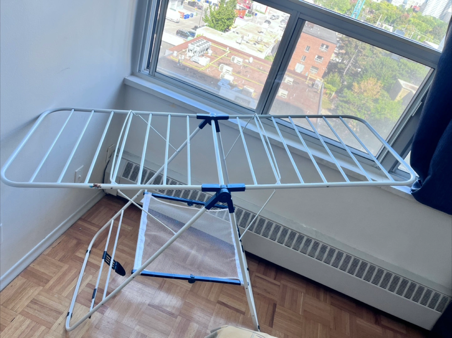 Selling a Mainstays heavy-duty drying rack. It has 43 feet of drying space. It's a great way to save on energy costs and is easy to store when not in use. It's in excellent condition!