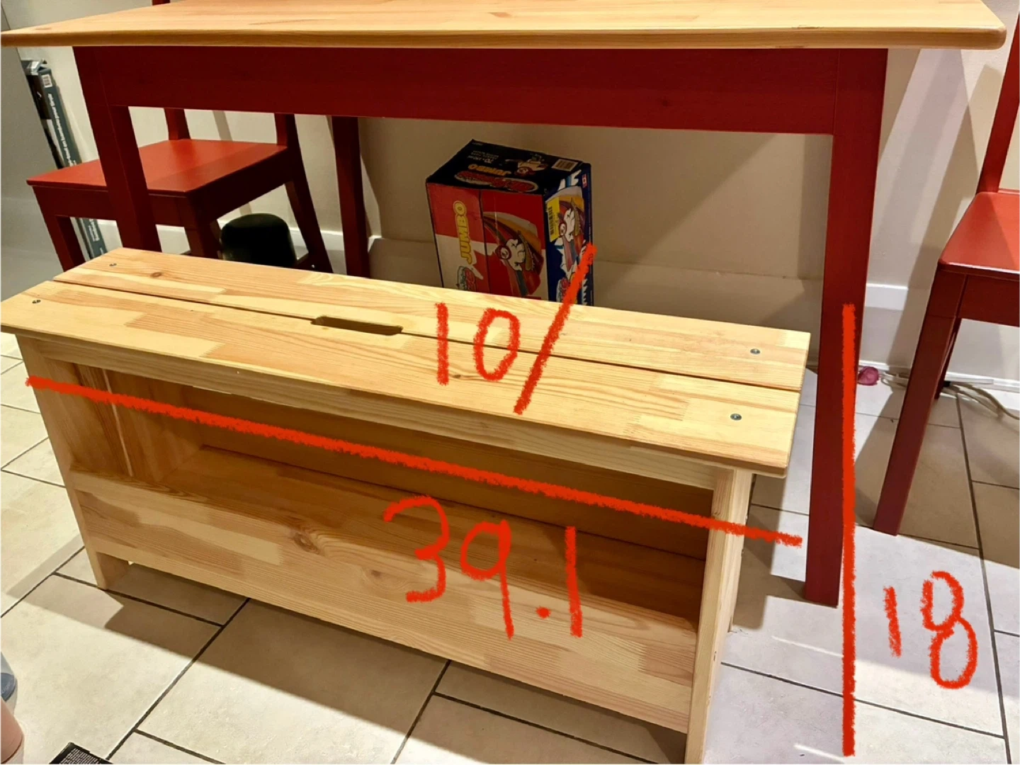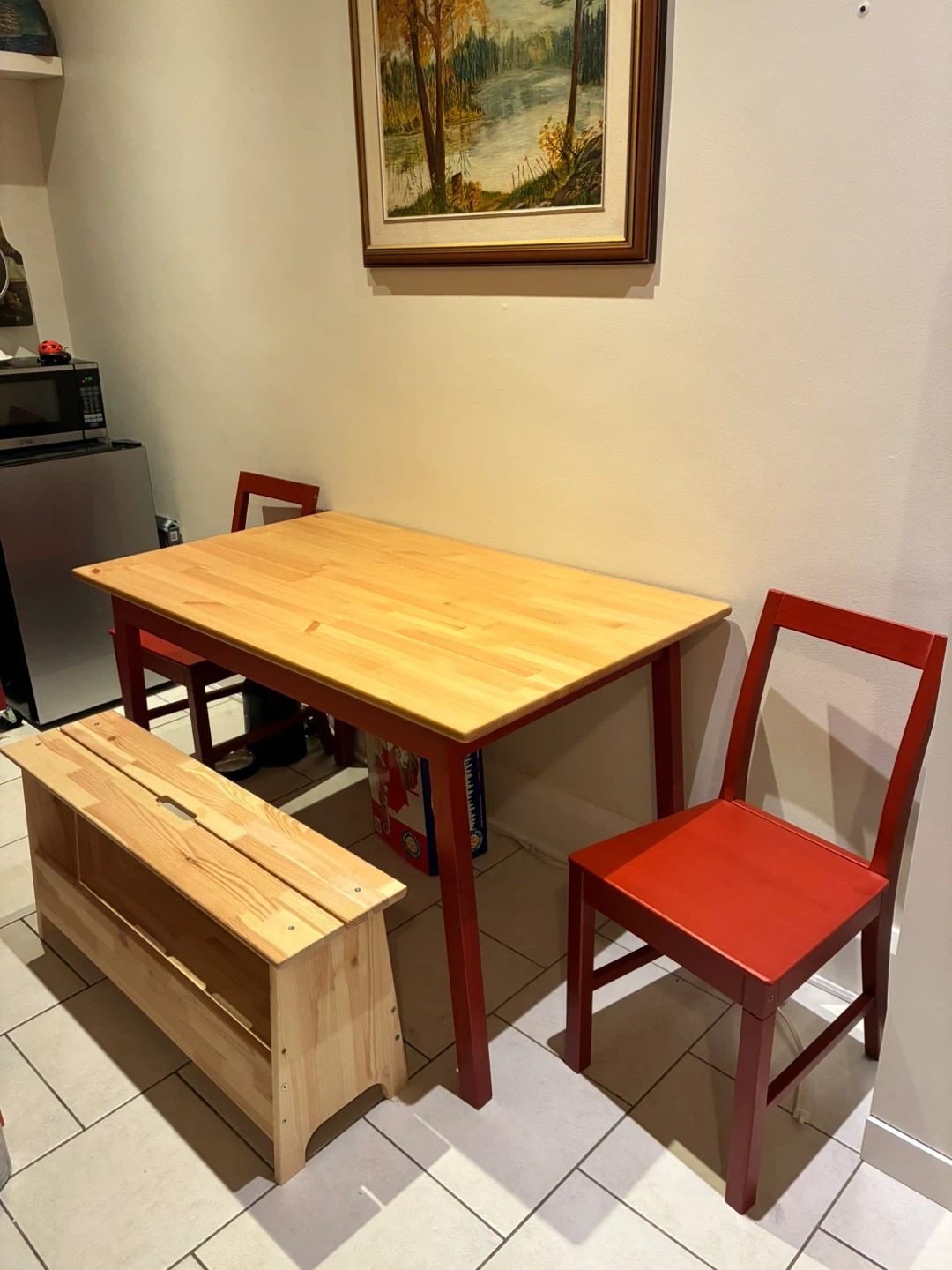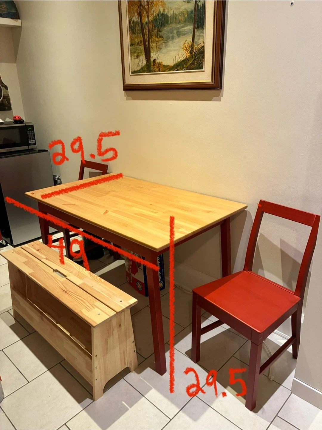 78Dining room set including a table, two chairs, and a storage bench! The table is approximately 29.5 inches tall and 49 inches wide. The chairs are approximately 32 inches tall, 15.7 inches wide, and 15.4 inches deep. The storage bench is approximately 18 inches tall, 39.1 inches wide, and 10 inches deep I have posted the items separately as well. I am willing to sell them individually