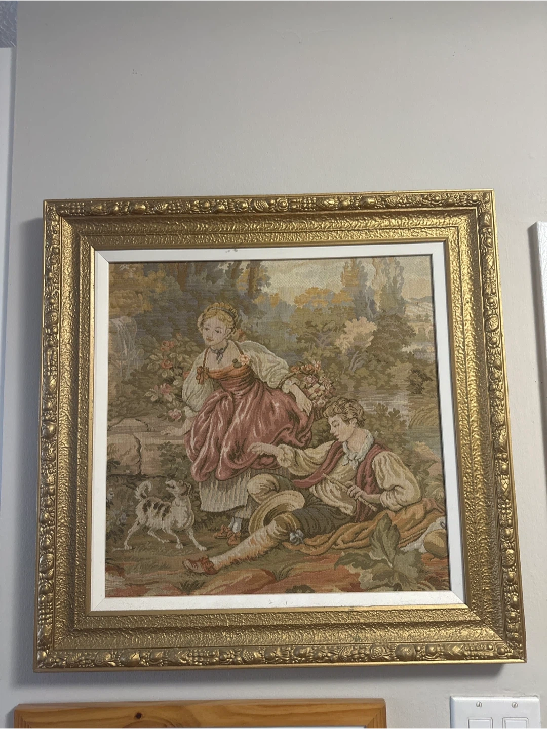 A beautiful vintage tapestry in a gold-coloured frame. It depicts a pastoral scene with figures and a dog. A charming piece to add a touch of classic elegance to your home decor