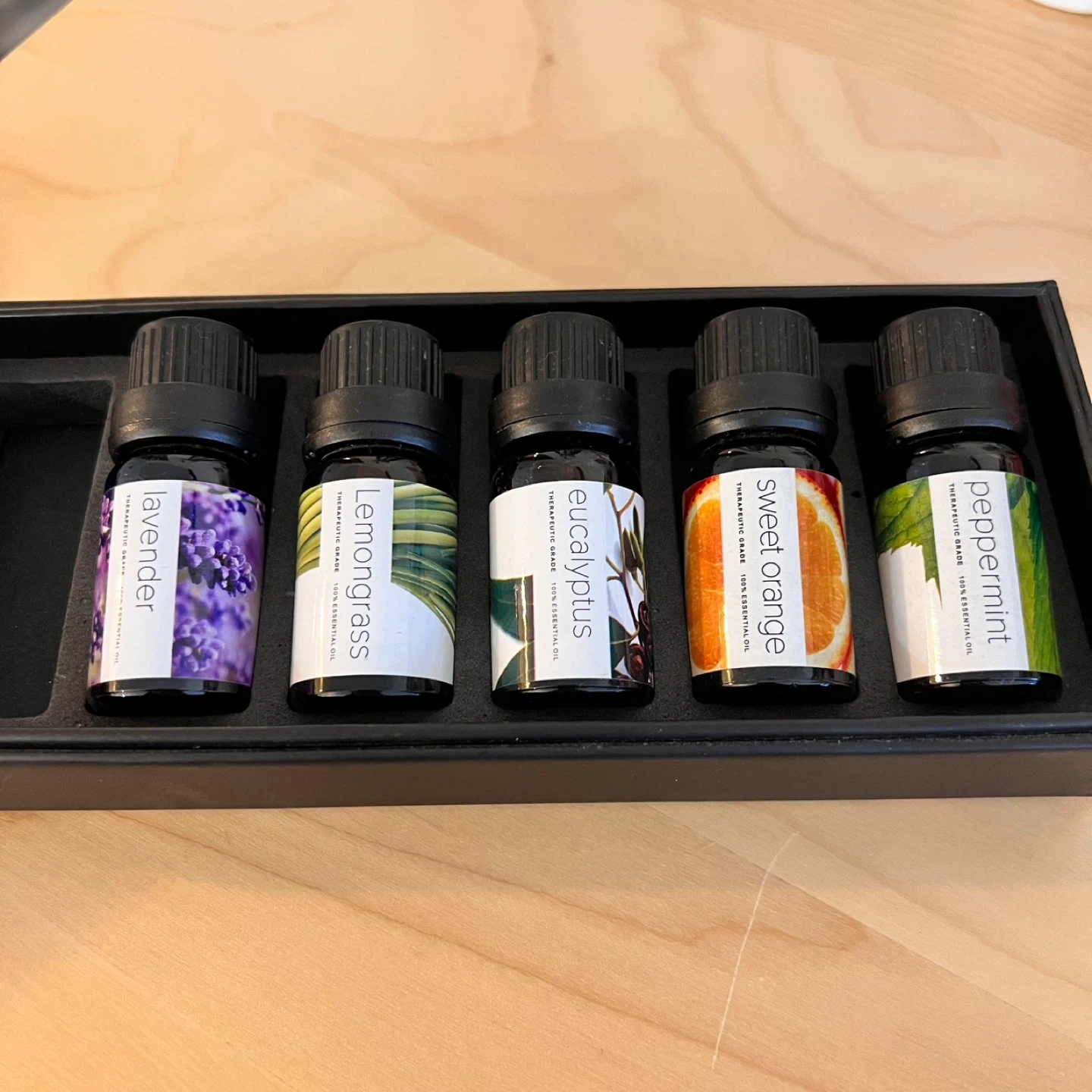 Originally a 6-bottle set, but selling 5 unused bottles (lavender, lemongrass, eucalyptus, sweet orange, and peppermint). Comes in the original box!