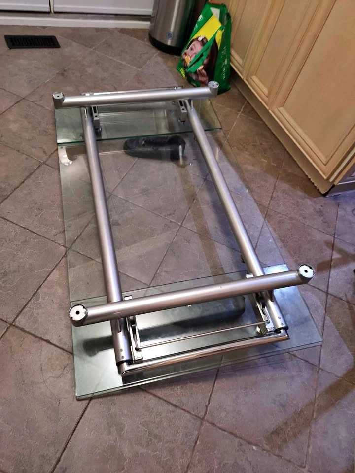 I already took the table apart, just the legs. It's heavy and the glass is thick with some wear on it.