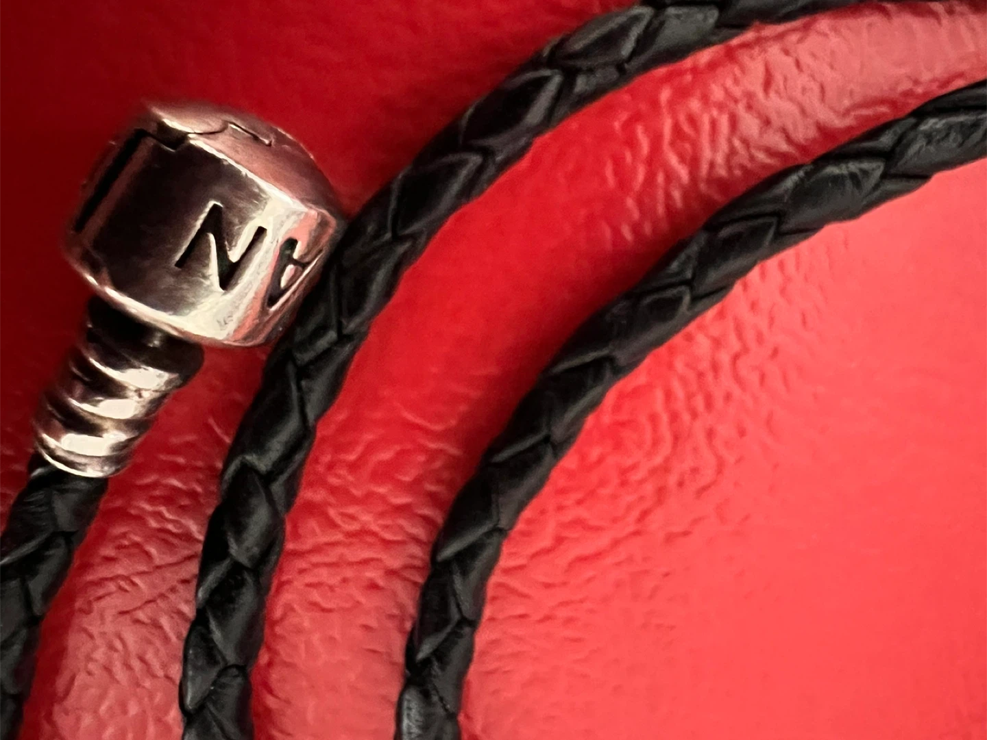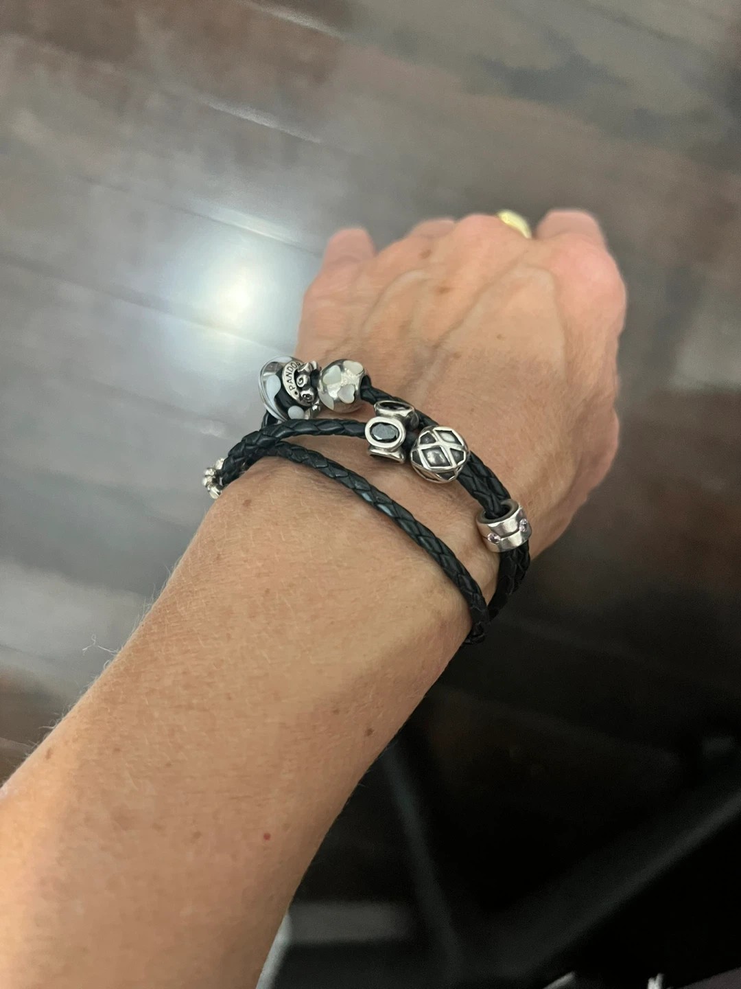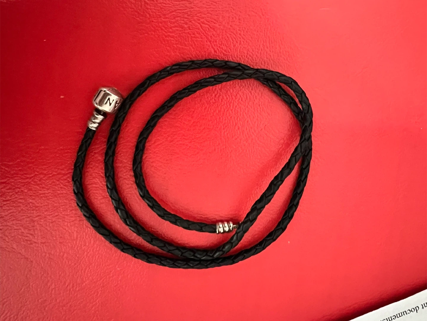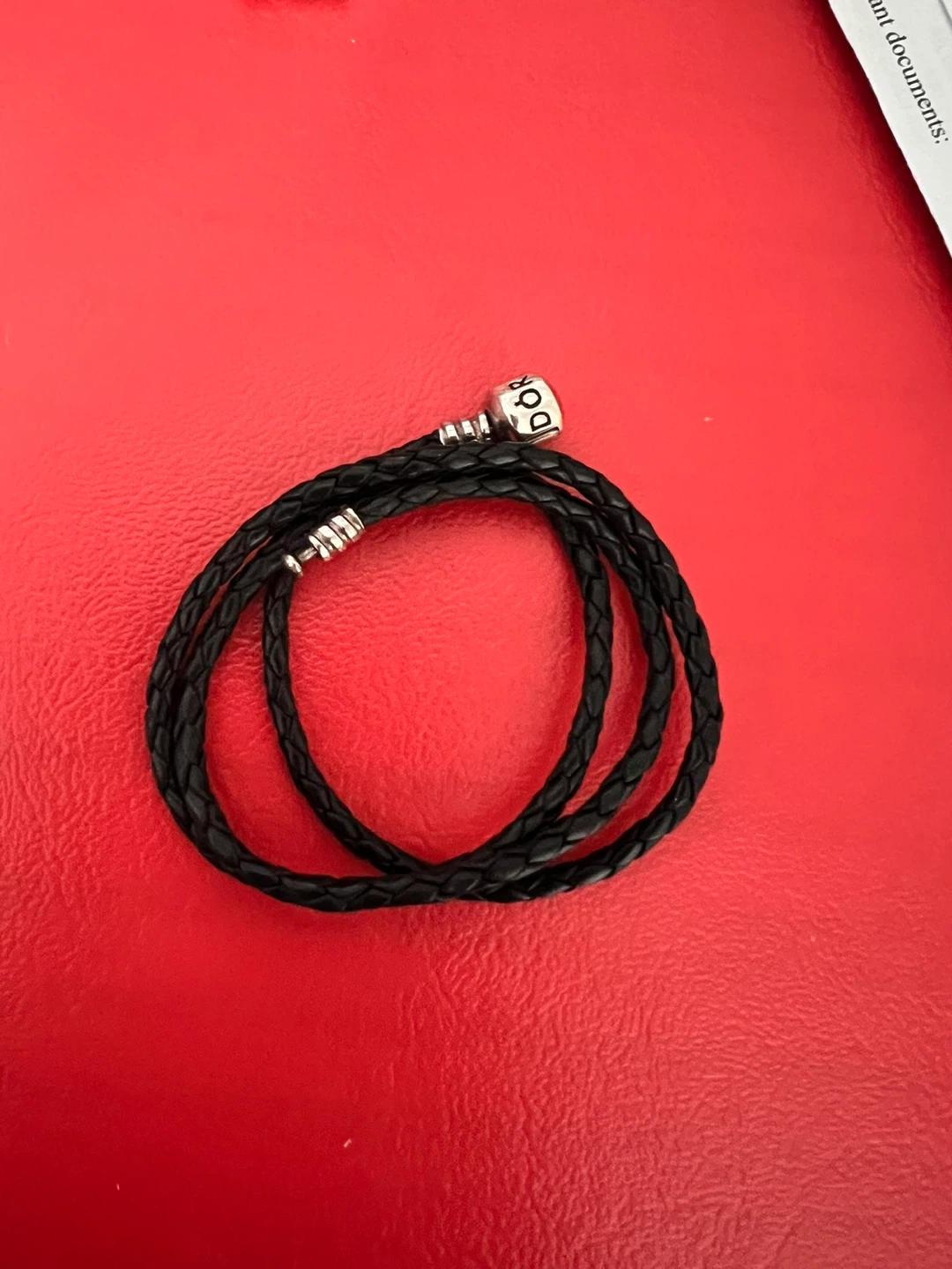 Black leather Pandora bracelet (does not include charms but they’re available to purchase separately). Images with charms included to show the look of this bracelet.