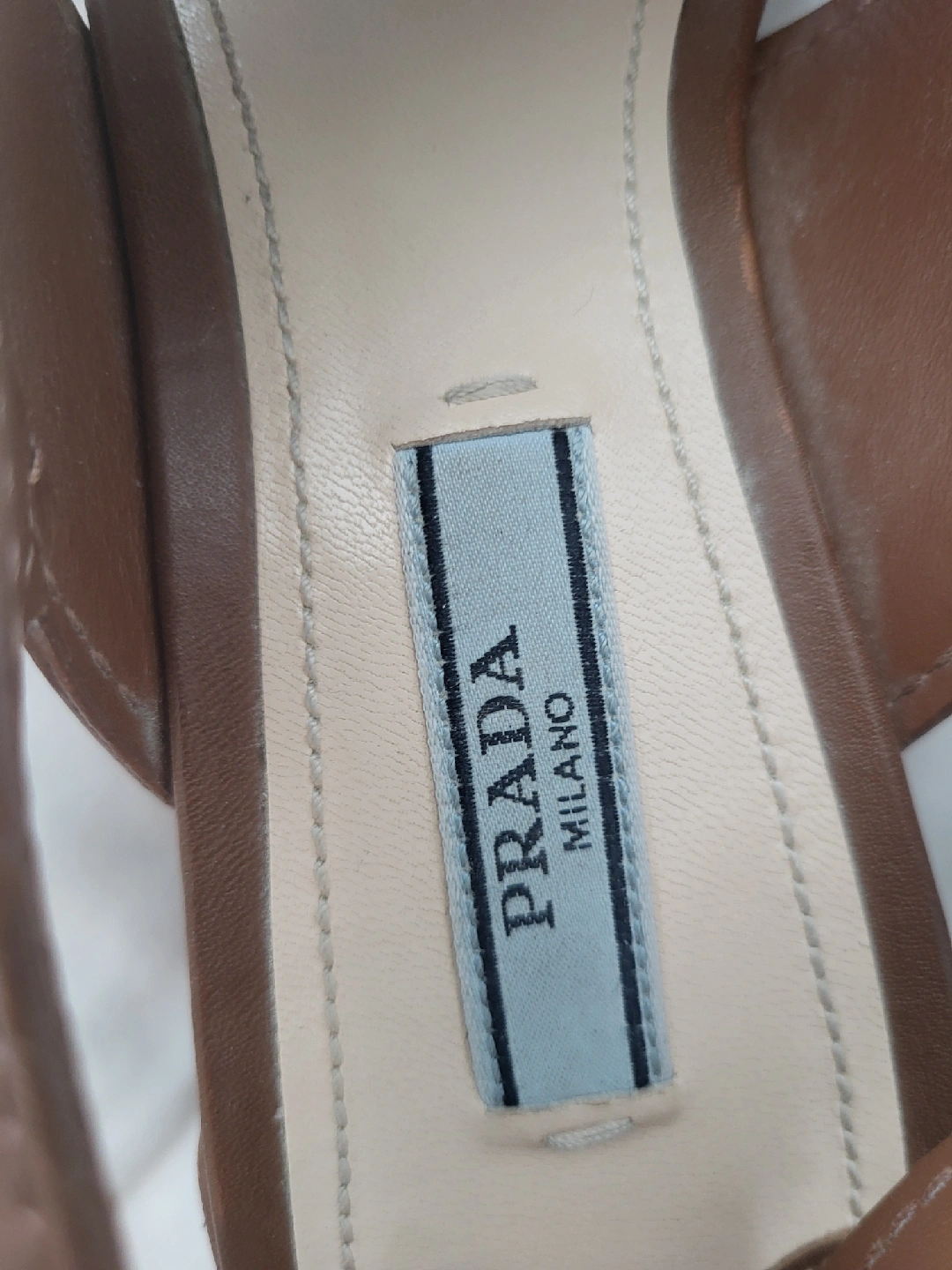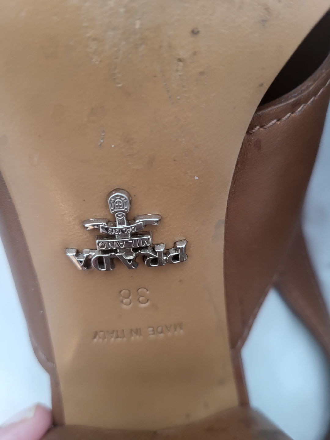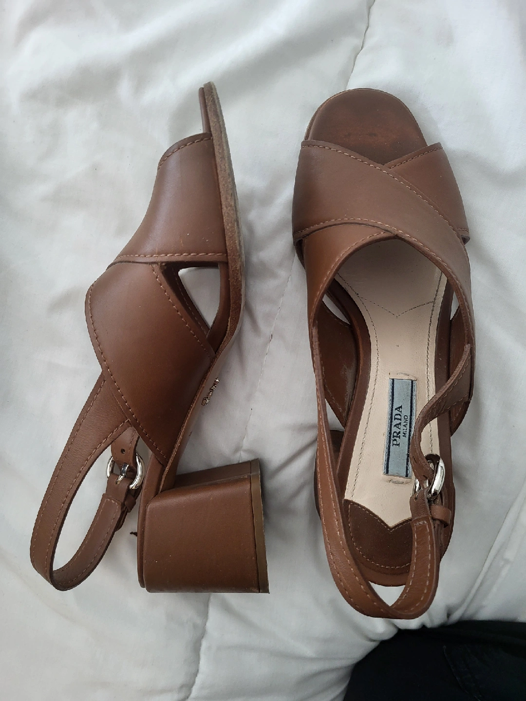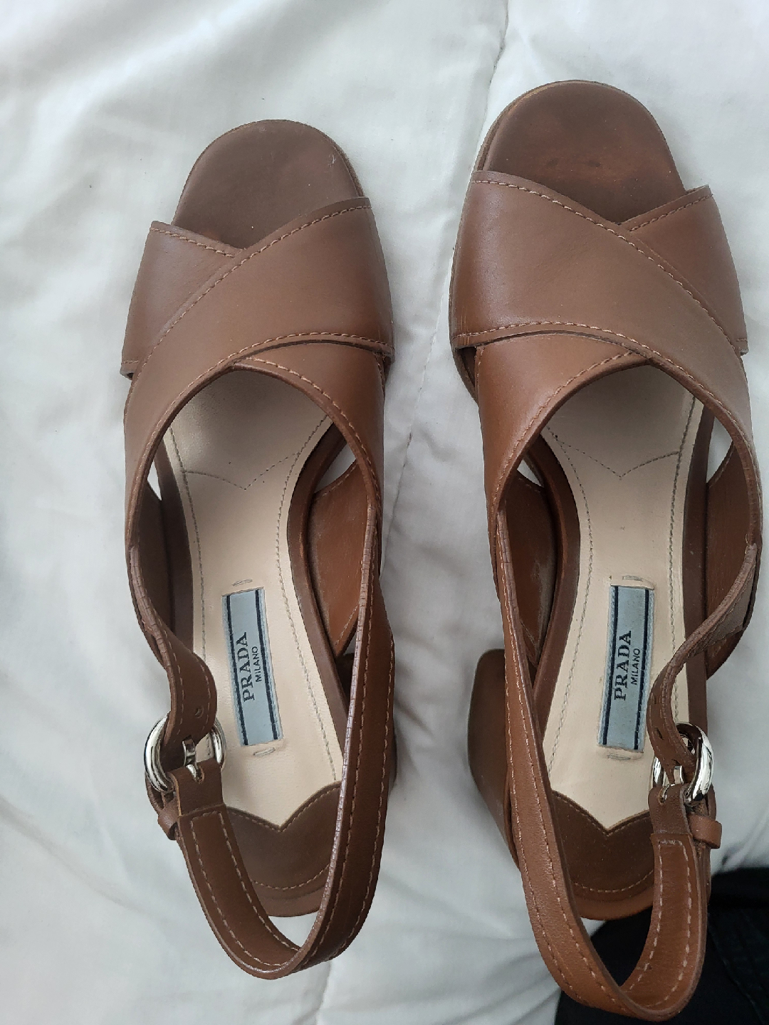 Selling a pair of Prada brown leather heeled sandals. These are a size 38 and feature a stylish criss-cross design. They're in great shape and ready for a new home!