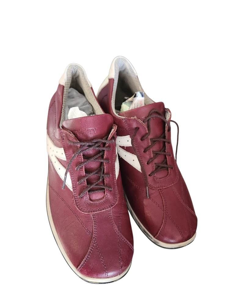 Selling a pair of Vagrant burgundy leather sneakers. They feature a white stripe design and are in good condition. Perfect for casual wear!
