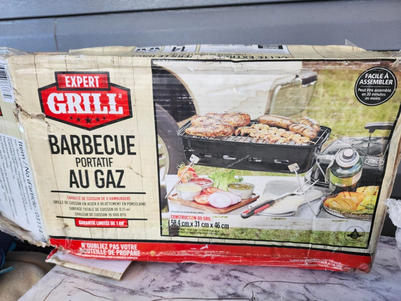 Selling a brand new Expert Grill portable propane BBQ still in its original box! It's perfect for camping, picnics, or small spaces. The grill has a porcelain-coated steel cooking surface and is easy to assemble. The cooking surface is 58.4 cm x 31 cm x 46 cm. Get ready to grill on the go!