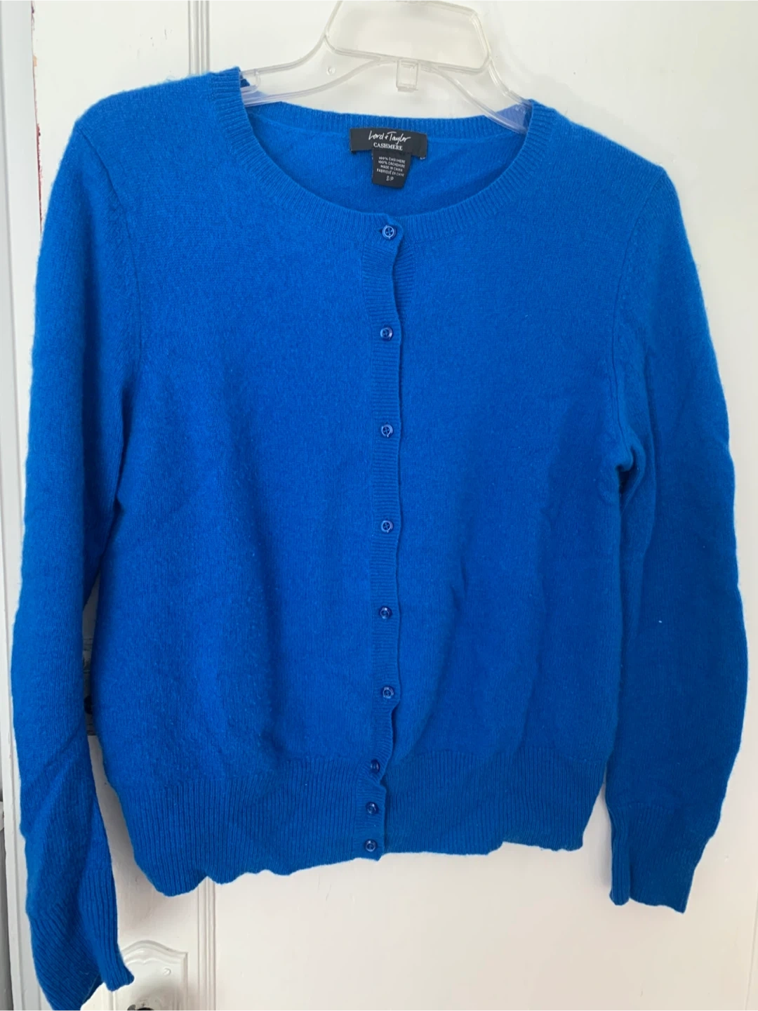 This is a beautiful blue cashmere cardigan from Lord & Taylor. It's a size small and in great condition! Made of 100% cashmere, it's super soft and cozy. Perfect for layering!