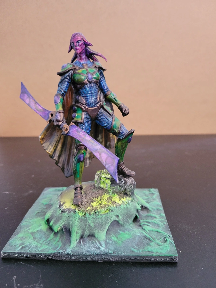 It features a female Zeno warrior with a double-blade twin staff weapon. Vibrant shades of metallic purple and green on a rocky summit base.
