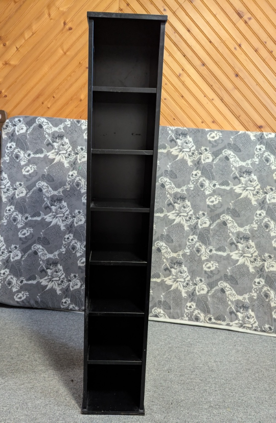 I'm selling a black tower shelf, perfect for storing CDs or DVDs! It has multiple shelves and is in great condition.