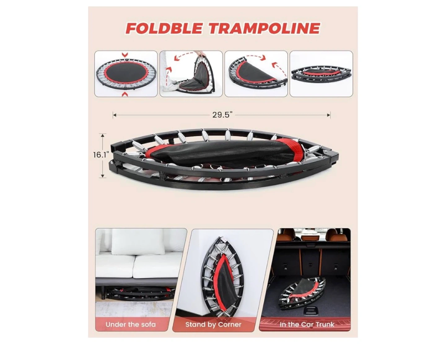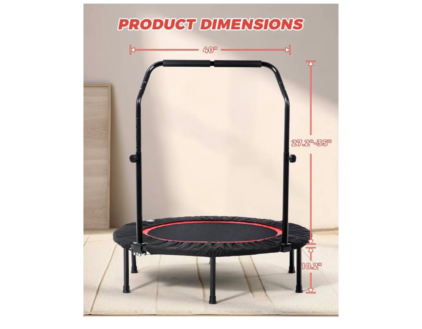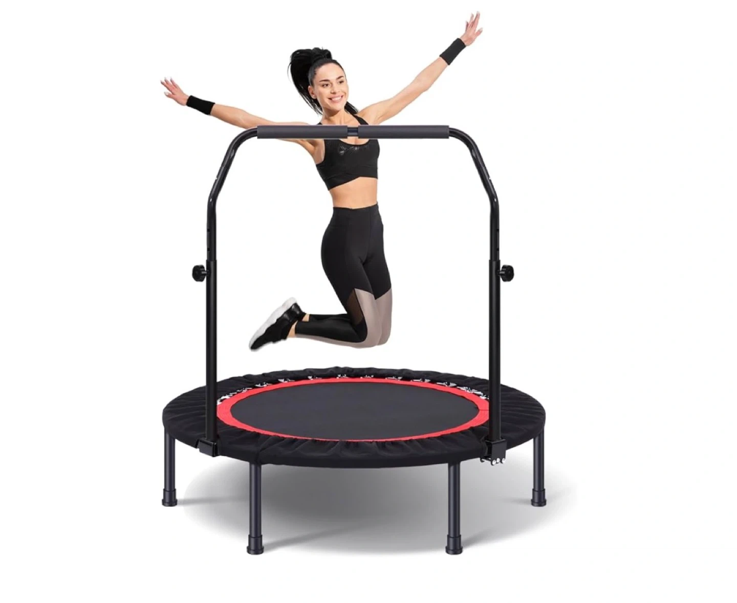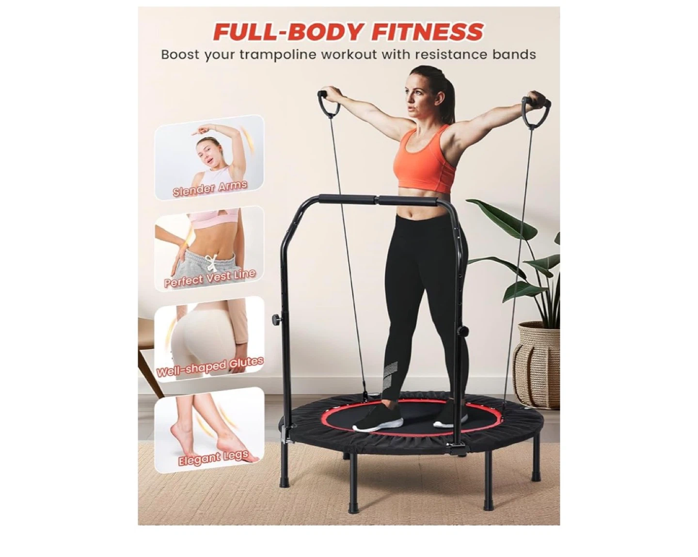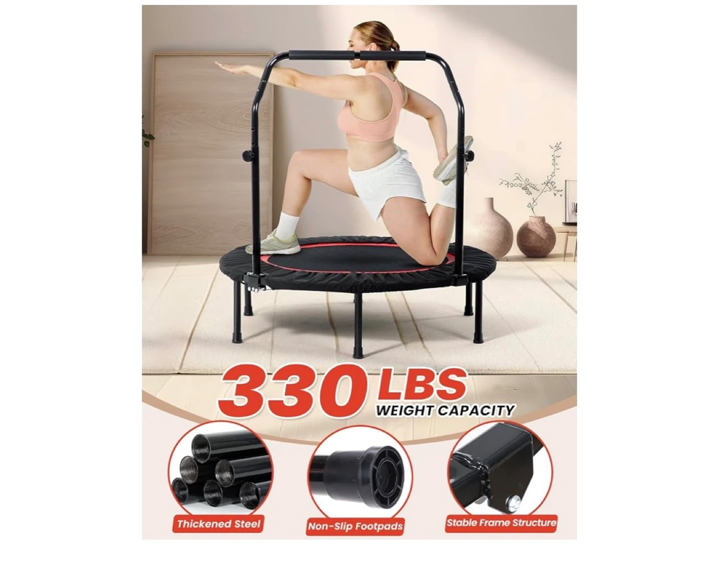 This trampoline is designed for full-body fitness, with a thickened steel frame and non-slip footpads. It supports up to 330 lbs and can be folded for easy storage. The adjustable handle makes it suitable for various exercises.