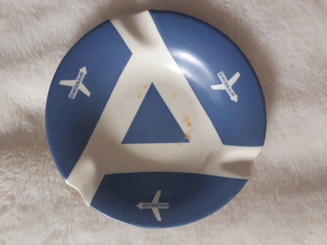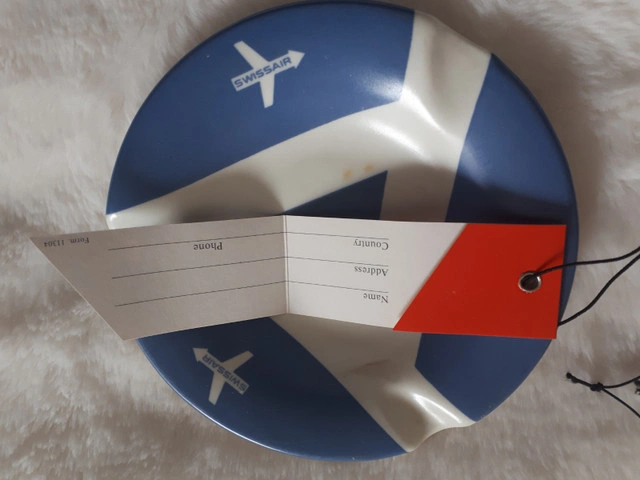 10Plastic Swiss Air ashtray and 11 luggage tags for sale. Paper tags are mint. Plastic tray is some yellow marks (see photos).