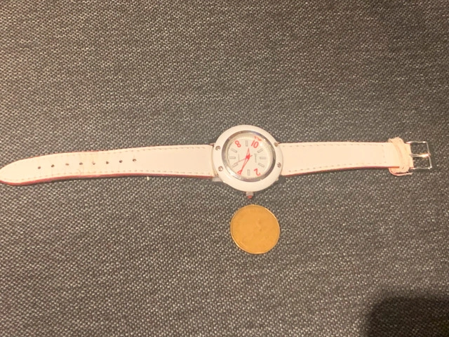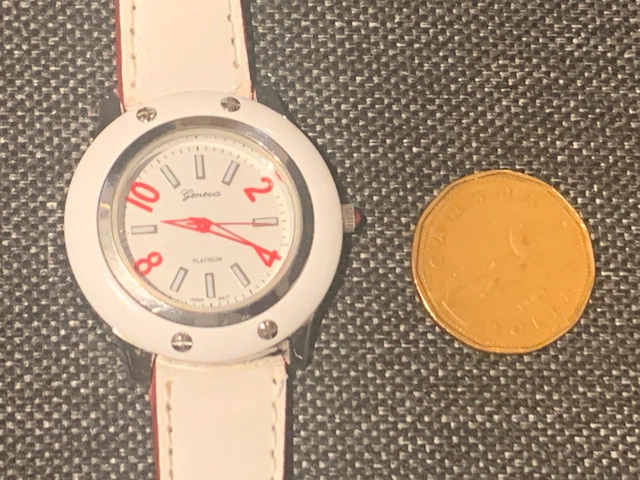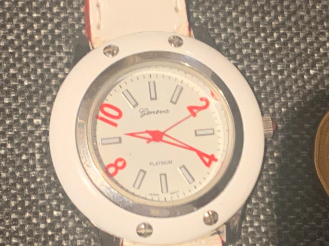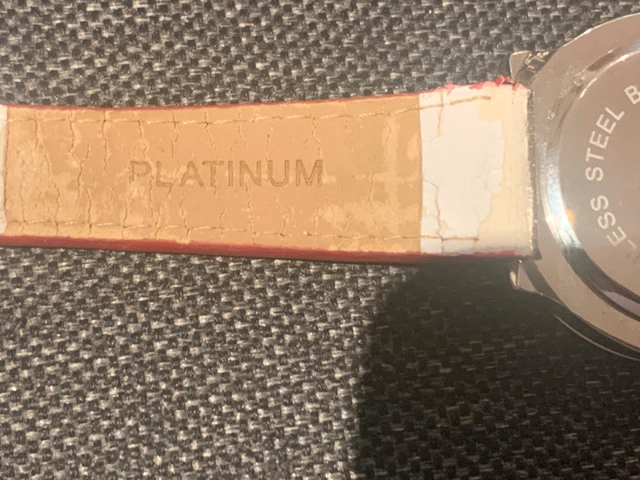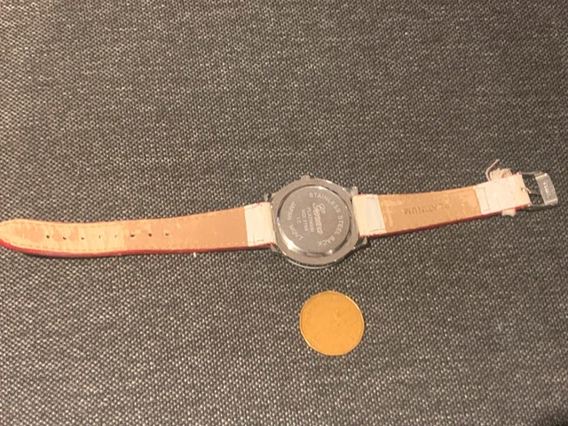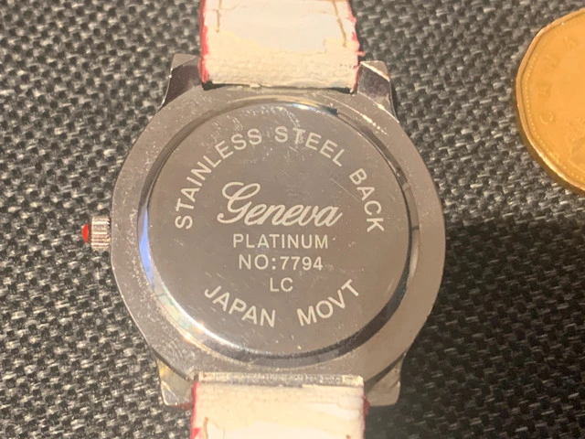 10This women’s Geneva platinum watch #7794 comes on a leather band and a new battery. Small mark on the bezel above the 12 o’clock. Band is showing signs of wear.