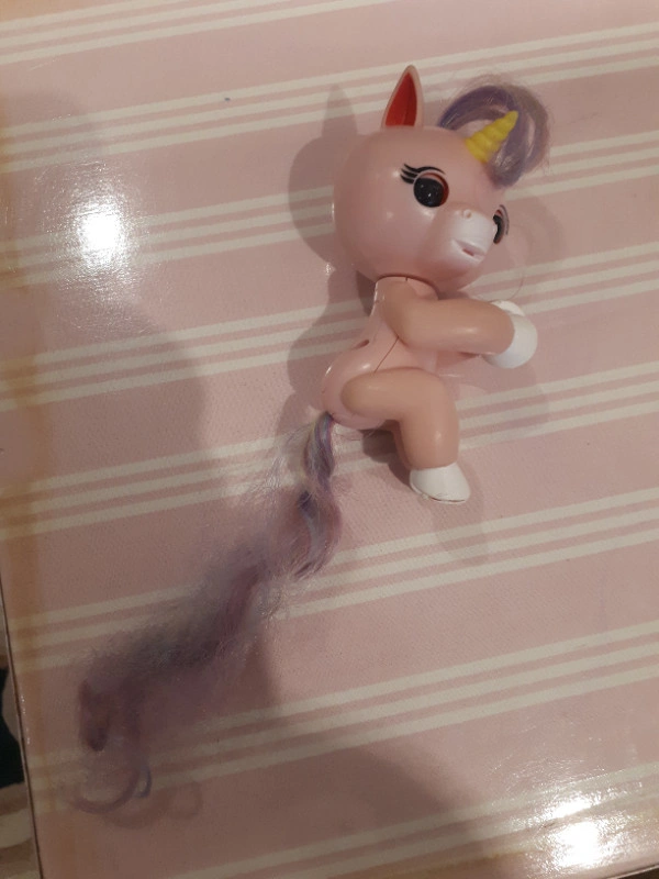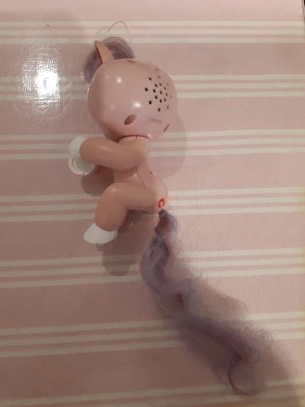 10Fingerlings Gemma Baby Unicorn. Made by WowWee, this fingerling has blinking eyes and 40+ sounds. It will react to touch and surrounding sounds. Batteries still work.