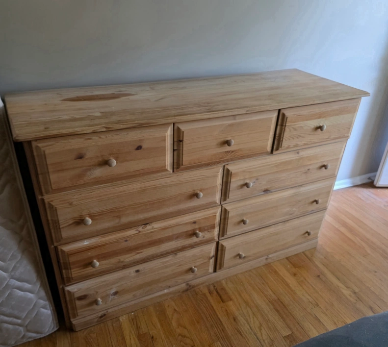 Selling a wooden dresser with a total of nine drawers. It's a great piece for adding storage to any room. The dresser has a natural wood finish. Dresser is in great condition.