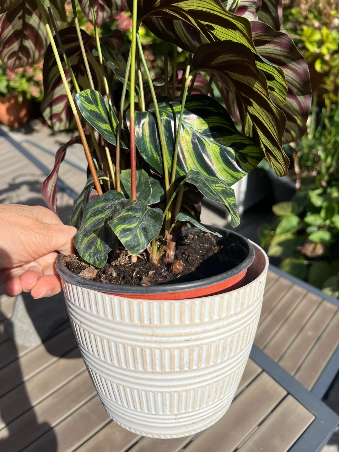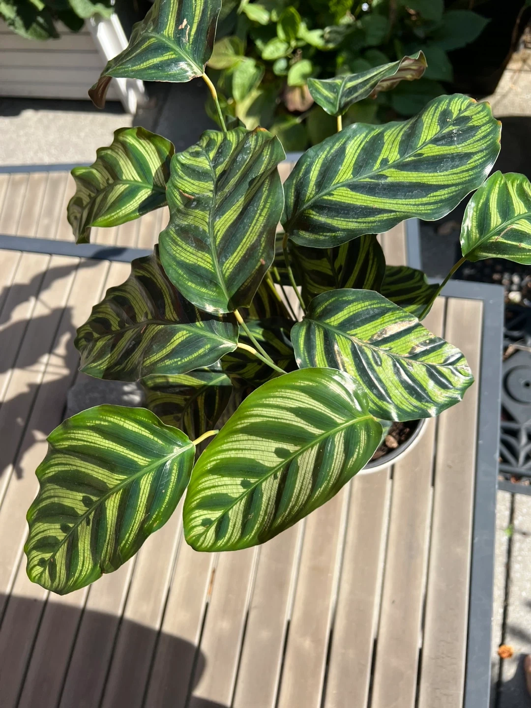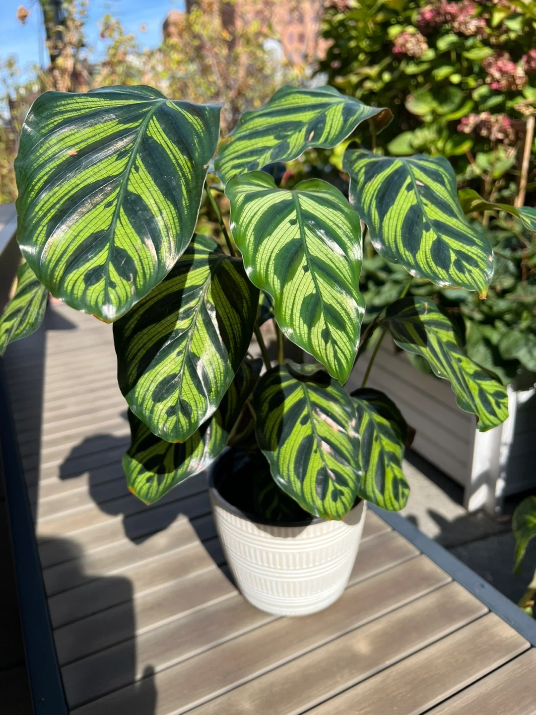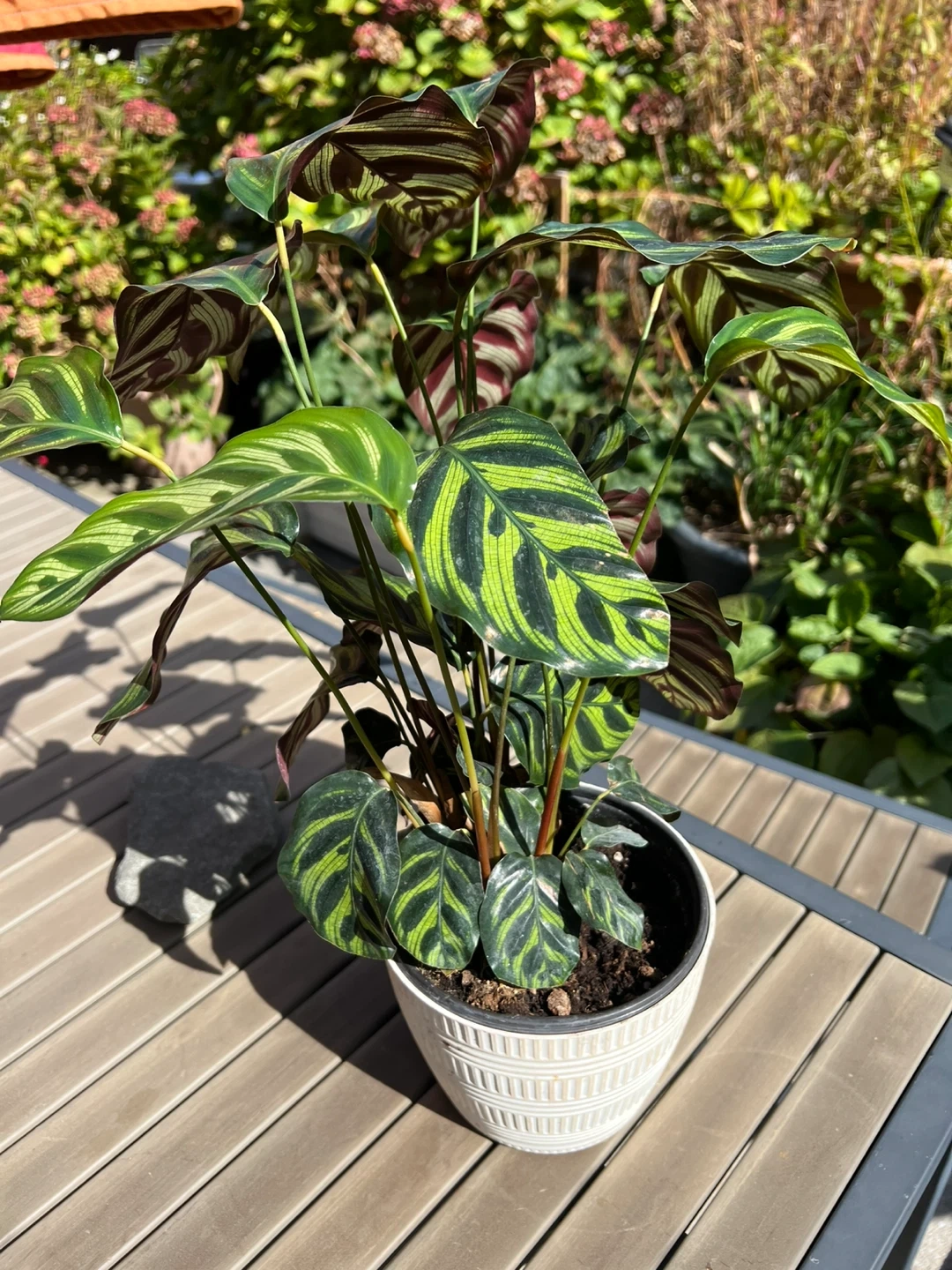 Selling a beautiful Calathea plant! It comes in a stylish white pot. The leaves have a striking striped pattern, adding a touch of nature to any space