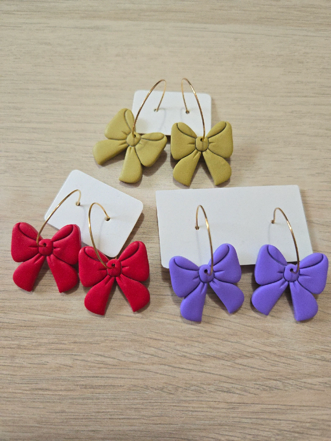 Cute handmade bow hoop earrings in three colours: red, purple, and olive! These are perfect for adding a pop of colour to any outfit.