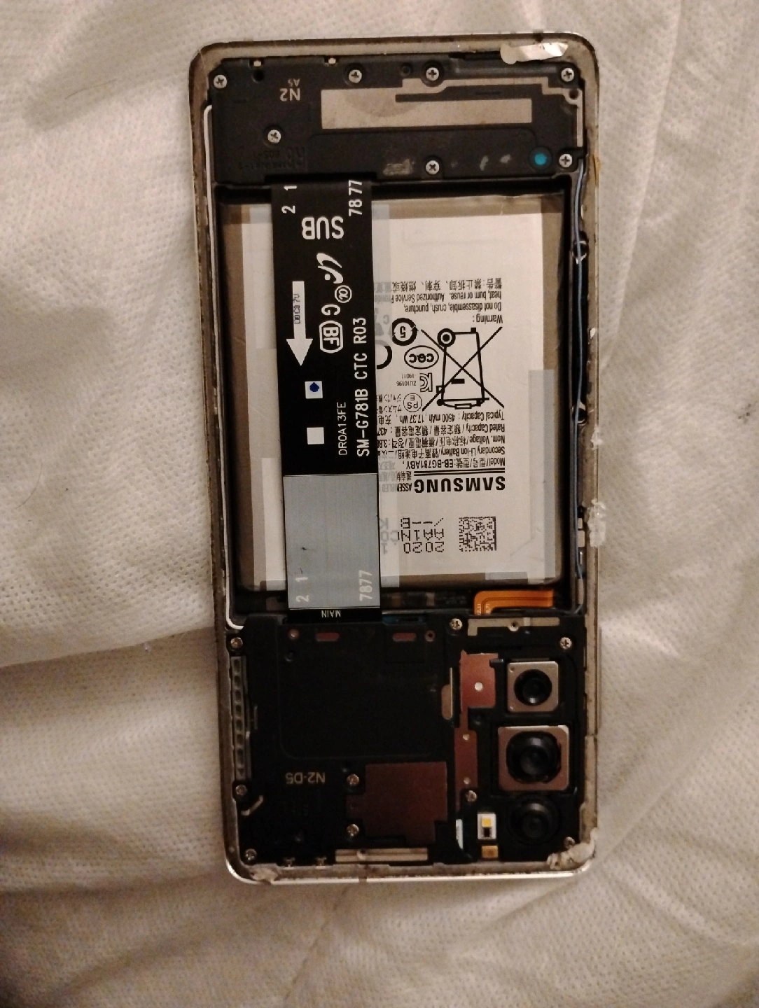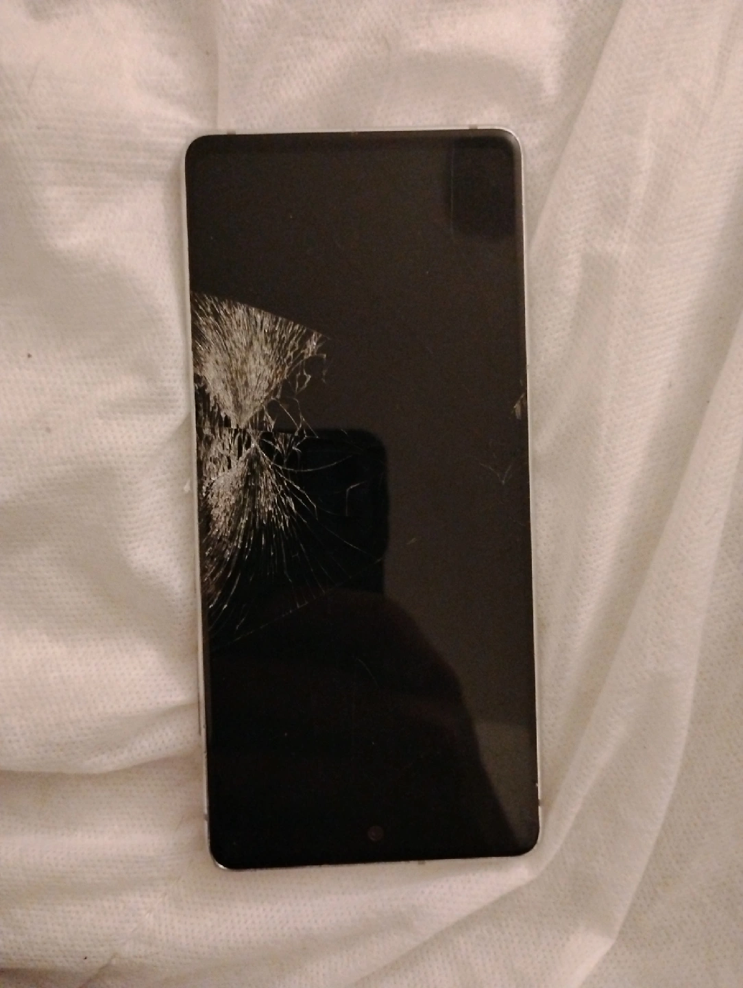 Selling a Samsung phone with a cracked screen. The back is also open, exposing the battery and internal components. Suitable for parts or repair if you're handy! for parts.