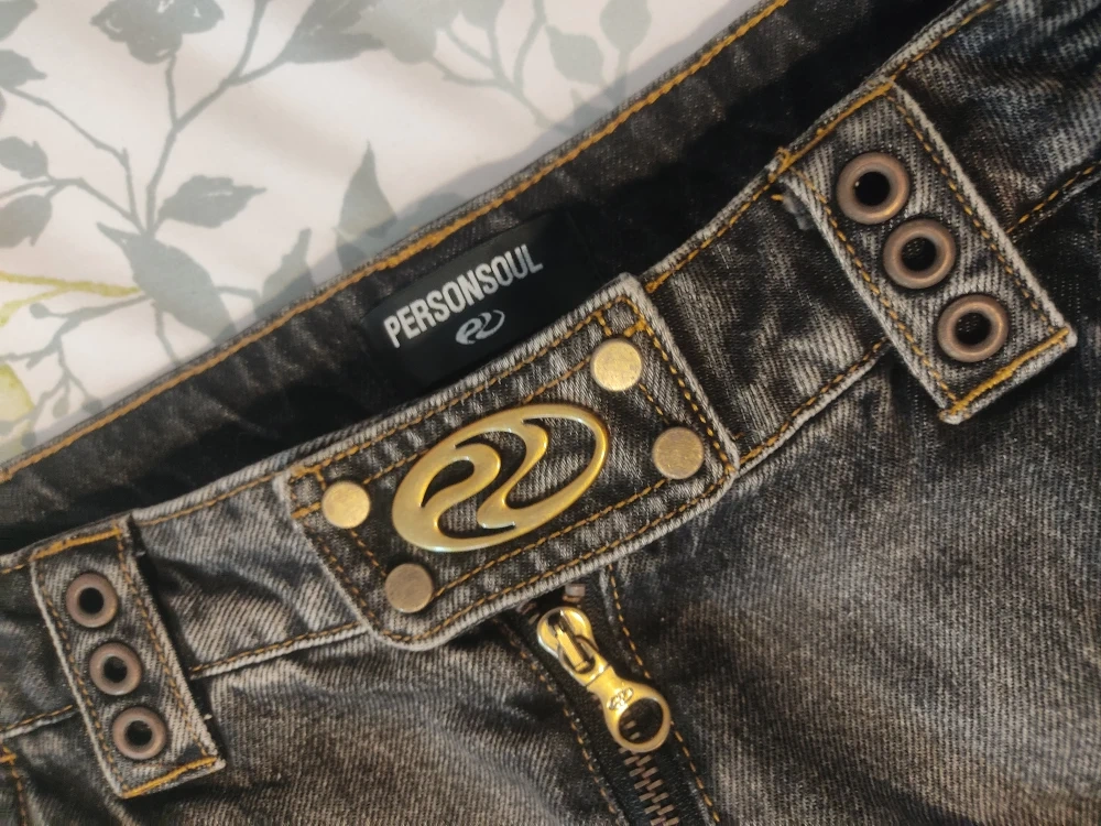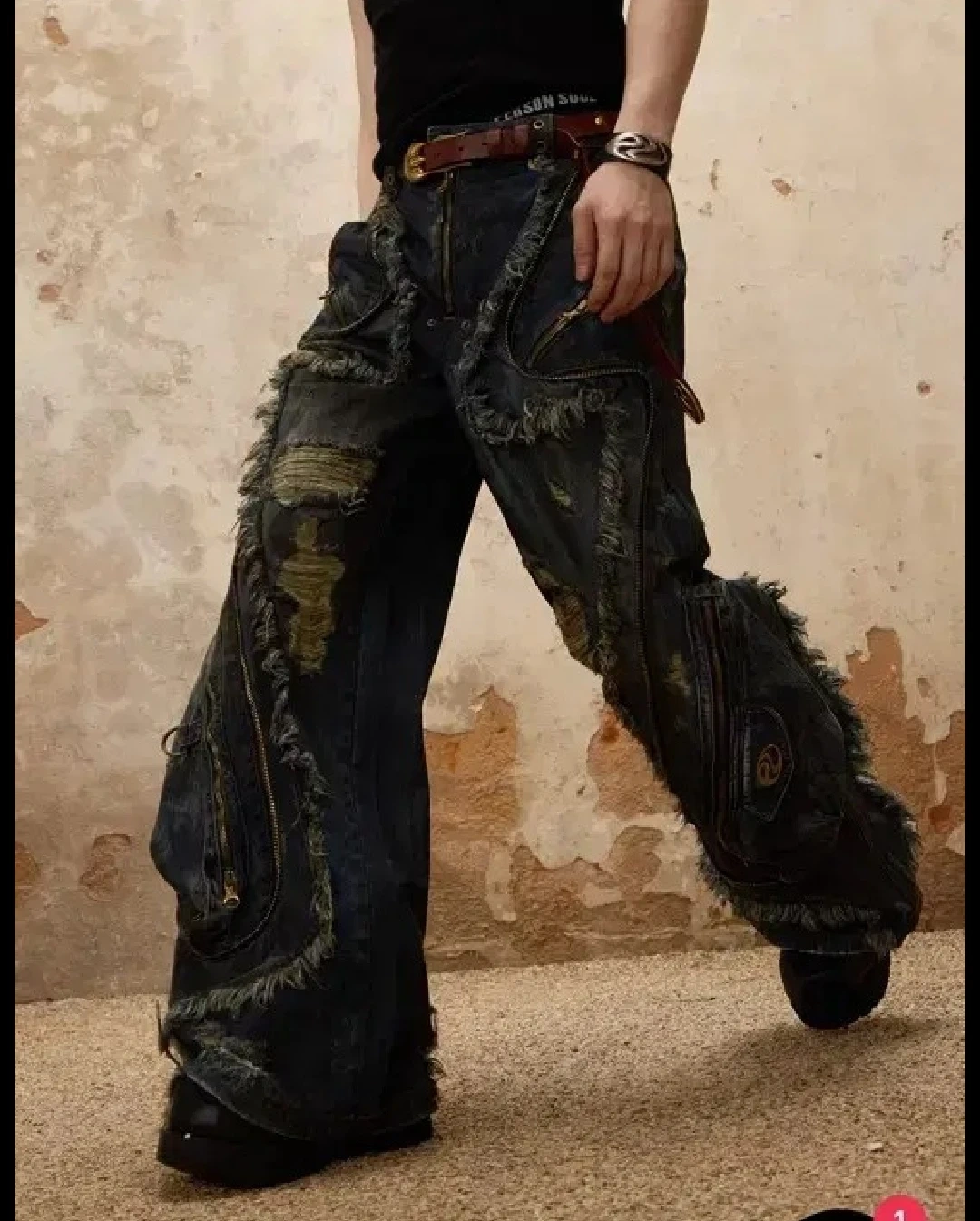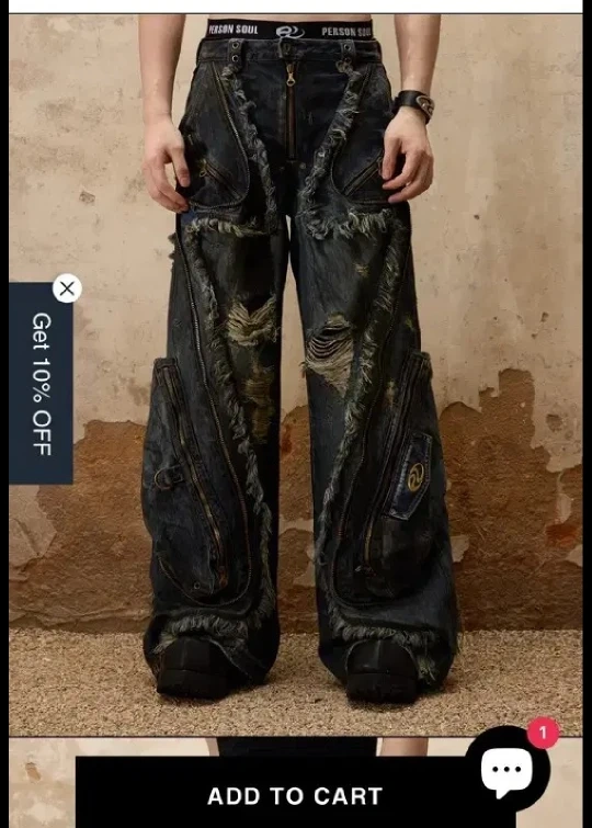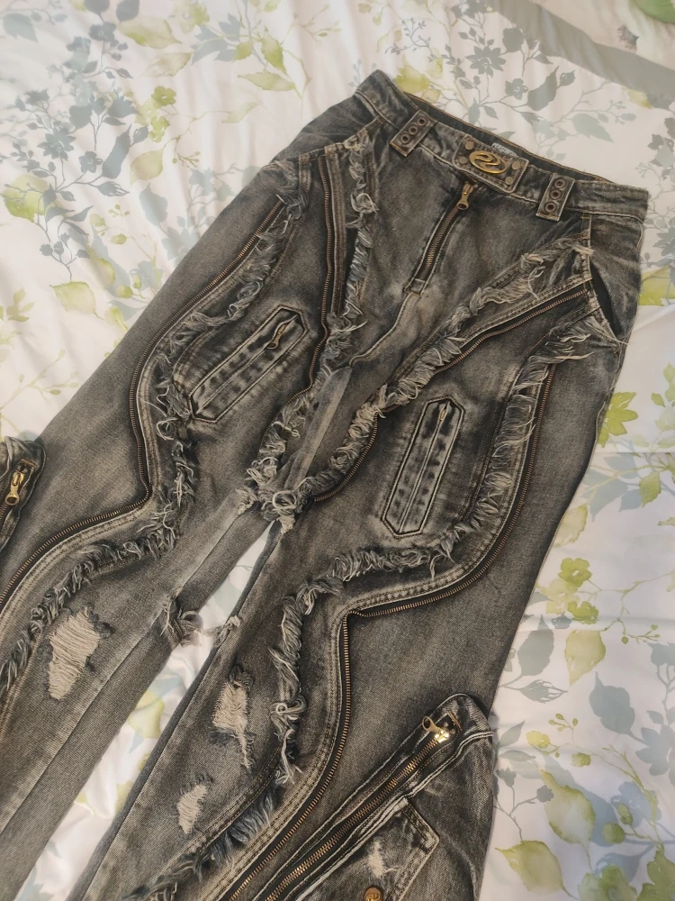 Selling a pair of distressed denim pants from Person Soul. The pants feature a unique design with large pockets and zipper details. They're in good condition and ready for a new home!