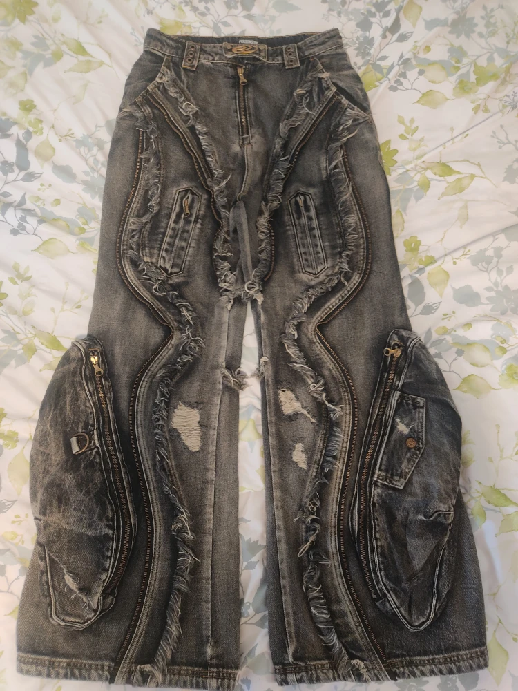 Selling a pair of distressed denim pants from Person Soul. The pants feature a unique design with large pockets and zipper details. They're in good condition and ready for a new home!
