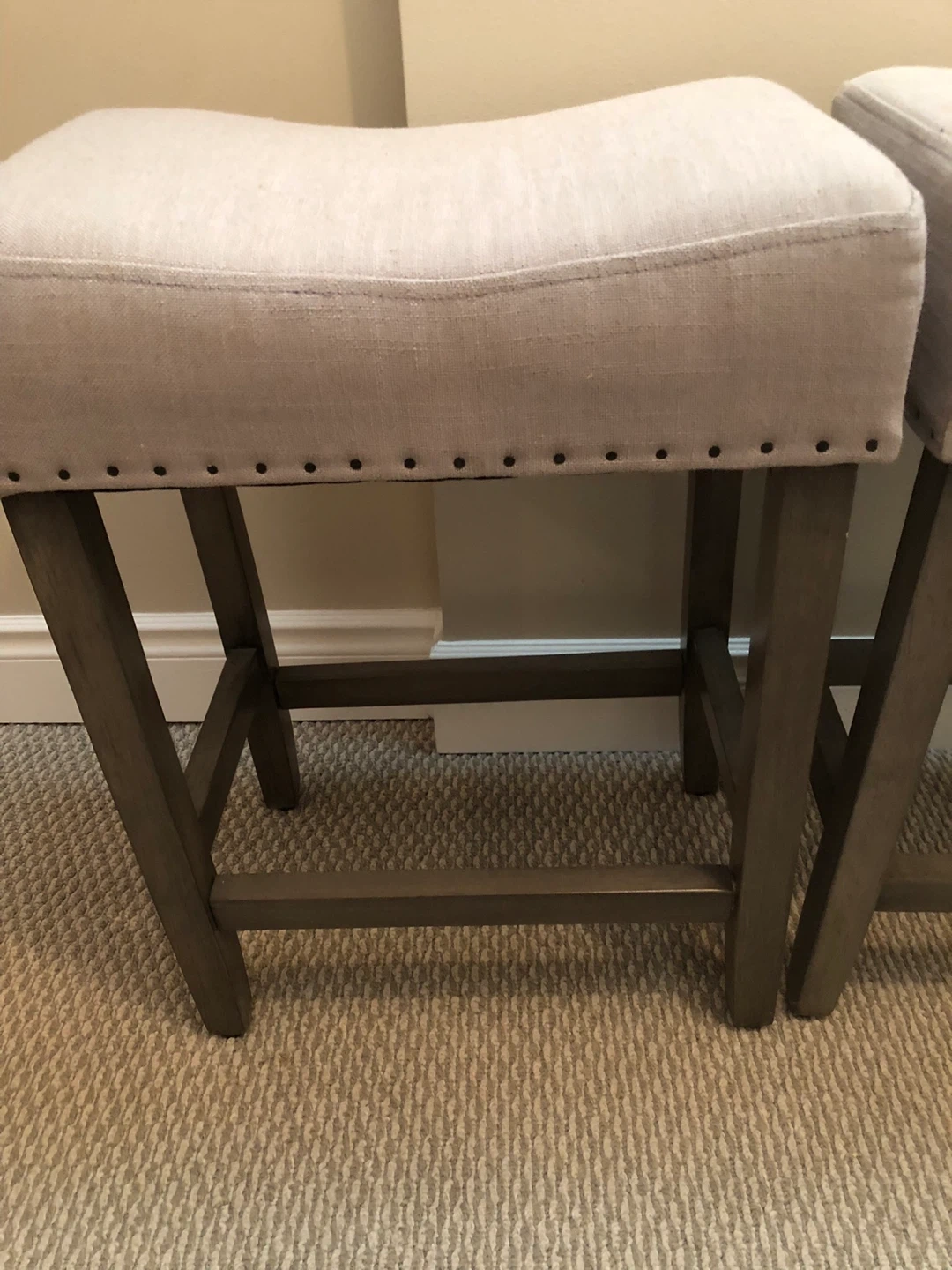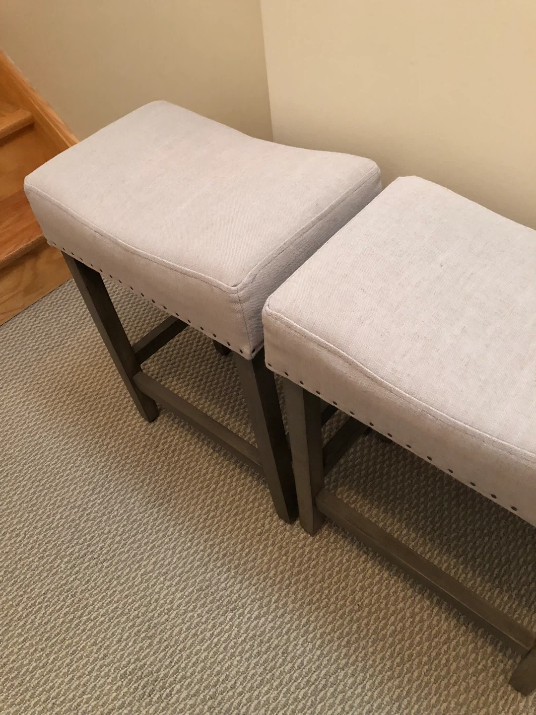 Selling a set of two Threshold upholstered counter stools. They have a grey weave fabric and grey washed wood base. Perfect for adding extra seating to your kitchen island or bar area! They're in great condition and ready for a new home