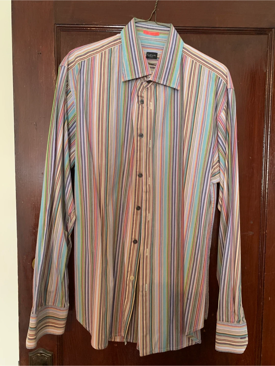 Looking to sell this Paul Smith London dress shirt. It's a size 16 1/2 and features a vibrant striped pattern. The material is 100% cotton, making it super comfy!