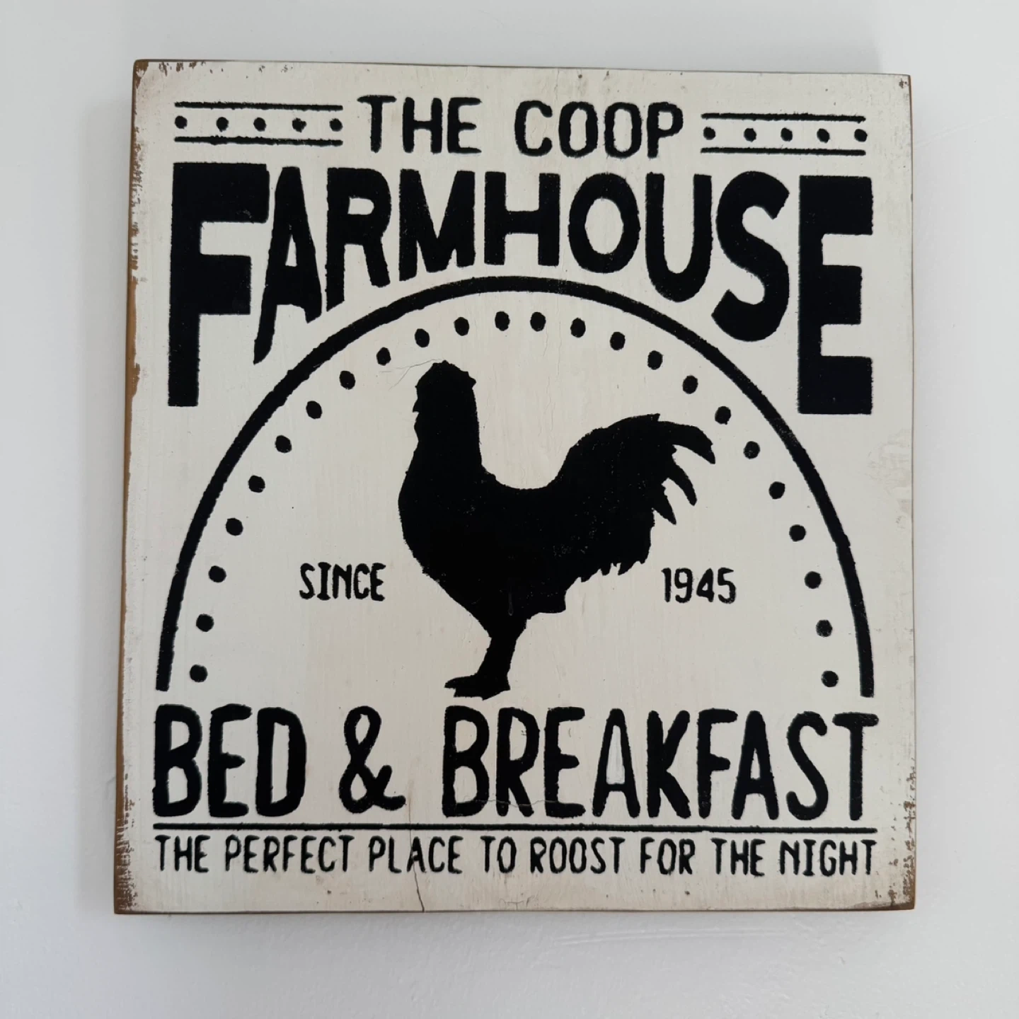 Selling a cute farmhouse-style sign that reads "The Coop Farmhouse Bed & Breakfast." It features a rooster design and the text "Since 1945." The sign says, "The perfect place to roost for the night"! Ready to hang.