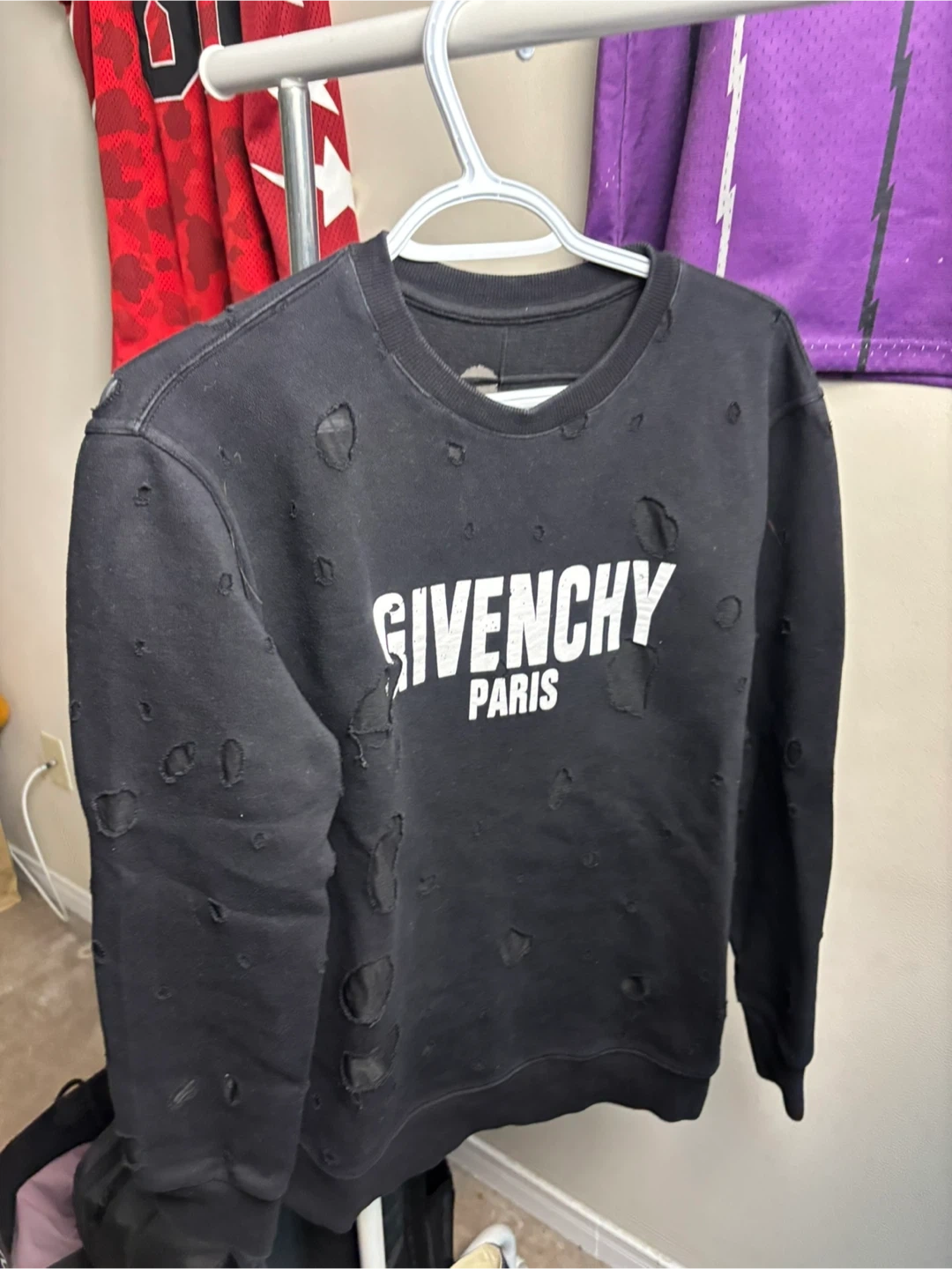 Selling a distressed Givenchy Paris sweatshirt. It's a size L and made of 100% cotton. The sweatshirt has a unique, worn look with intentional distressing throughout. Perfect for adding an edgy touch to your wardrobe!
